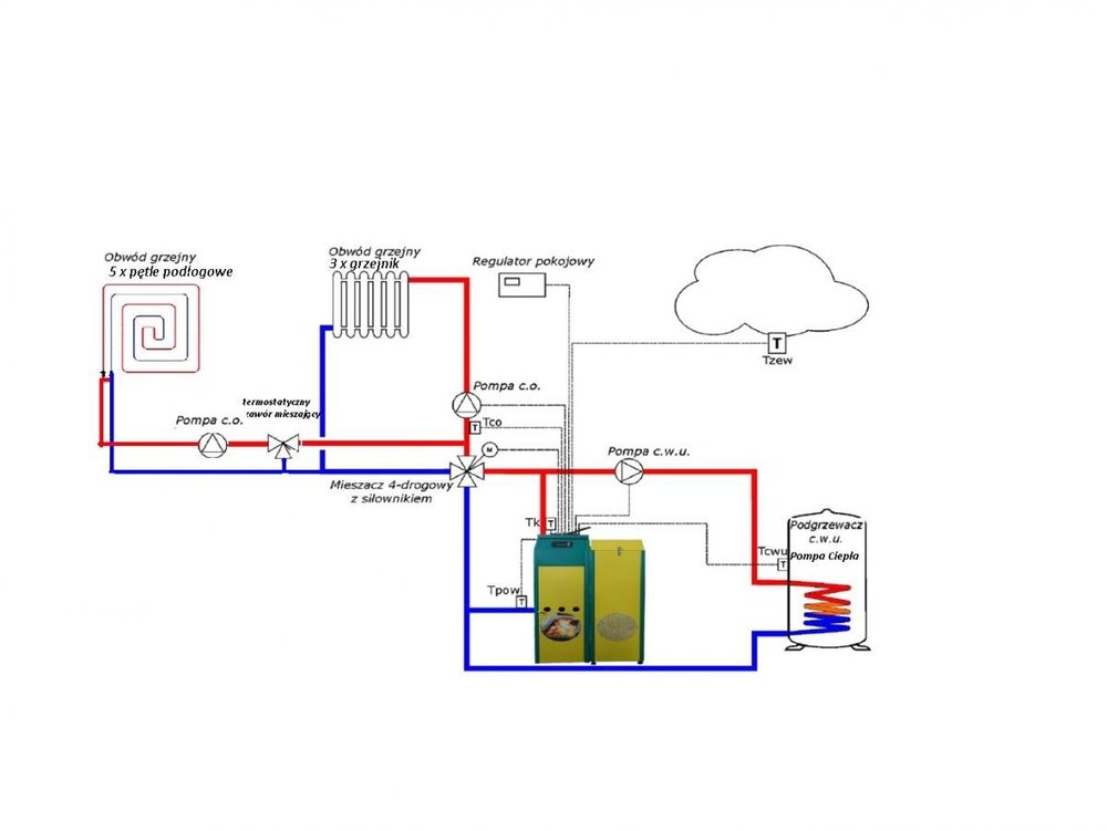 Witam. Od pewnego czasu dostrajam ustawienia w sterowniku ale pewnych rzeczy nie rozumiem, w związku z czym proszę o wskazówki. W instrukcji jest napisane , że obniżenie nocne dla kotła powoduje jego wygaszenie , akurat taka opcja by mi pasowała, aczkolwiek u mnie po uruchomieniu obniżenia nocnego, ustawieniu harmonogramu oraz wartości obniżenia , kocioł zamiast wygaszać się obniża zadaną temperaturę. Moja instalacja przypomina tą z rysunku poniżej, posiadam 2 pompy CWU i mieszacza oraz zawór 4D, nie rozumiem filozofii ustawienia minimalnej temperatury pompy CO. Mianowicie by działała mi pompa CWU i mieszacza temperatura kotła musi być wyższa od parametru "Temperatura załączenia pompy CO" , co jest dla mnie dziwne, ponieważ ja nie używam pompy CO, nie jest u mnie podłączona , używam jedynie pompy mieszacza i CWU. Czy to ma coś wspólnego z ustawieniem w mieszaczu "obsługa mieszacza: pompa CO" , rozważałem ustawienie "tylko pompa" ale opis funkcji straszy wyłączeniem zaworu 4D. Dodatkowo po przekroczeniu temperatury Temperatura załączenia pompy CO" pompa mieszacza zaczyna pracować... ignorując to , że np zawór 4D jest zamknięty czyli dogrzewa jedynie powrót. Bonusowe pytanie, czy macie w sterownikach nowsze softy niż z 2016? Pozdrawiam -