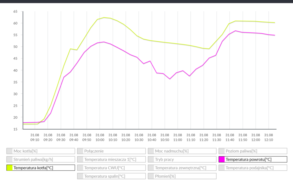 Po krótkiej przerwie udało mi się dokończyć instalację i uruchomić kocioł. Wszystko działa prawidłowo , w tym również zawór 4D działający grawitacyjnie. Na poniższym wykresie widać moje poranne zabawy, do godziny 11:00 zawór był ustawiony domyślnie, później aktywowałem funkcję ochrony powrotu. W szczytowym momencie spaliny miały około 92'C, co w porównaniu do kopciucha jest ciekawym doświadczeniem. Miałem drobne przygody , bo panowie od kotła odwrotnie wpięli podajnik zewnętrzny do sterownika (zaciski 4 i 3 ), podajnik co prawda działał i ślimak podciągał pellet, ale podczas testów ręcznych podajnika palnika, wentylatora czy pogrzebacza, wywalało błąd "uszkodzony system sterowania podajnikiem", co było lekko mylące, bo co to miało do wentylatora czy pogrzebacza. Problemem był N nie w tym miejscu na listwie. Po powrocie z wakacji , zabiorę się za dostosowanie ustawień , choć zapewne prawdziwa zabawa zacznie się dopiero zimą. Pozdrawiam Wszystkich. -