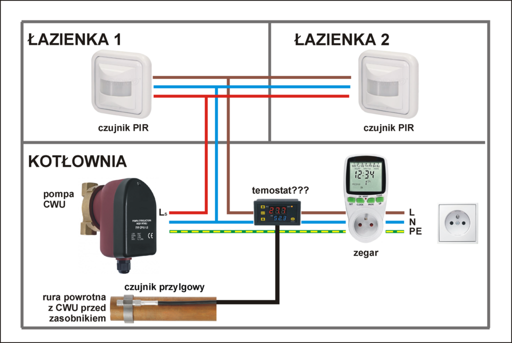 Witam, Przeszukując forum trafiłem na ten wątek, który porusza temat również mnie interesujący. Mianowicie sterowania pracą pompy cyrkulacyjnej CWU. Chciałbym u siebie w domu graniczyć jej działanie do minimum, ale nie stracić funkcjonalności cyrkulacji. Przeglądając forum i inne miejsca w sieci spodobał mi się pomysł sterowania pompa za pomocą sensorów PIR, które wykrywając ruch w łazienkach uruchamiają pompę CWU. Na tych czujnikach można regulować długość ich działania (praca pompy) w zakresie od 10s do 10min. Mnie interesują krótkie okresy tak tylko, żeby wodę przepchnąć przez układ. Nie mogę korzystać z włączników światła bo łazienki są całe w płytkach i doprowadzenie kabli jest niemożliwe, natomiast zostały mi stare rury gazowe po zasilaniu term gazowych, które zostały usunięte bo powstała instalacja CWU i tamtędy mógłbym poprowadzić kable do czujników PIR do kotłowni pod pompę CWU.Dodatkowo chciałbym, aby takie sterowanie działało tylko w określonych godzinach, czyli w czasie porannego wstawania, powrotu z pracy lub wieczoru przed spaniem, dlatego pomyślałem o programowalnym zegarze, który by odcinał lub podawał zasilanie do takiego obwodu pompy i działało by to według ustawionych programów.Ponieważ np. w godzinach wieczornych w łazienkach w podobnym czasie pojawiają się domownicy i w powyższym układzie ciągle uruchamiali by na krótkie okresy pompę cyrkulacyjną w momencie kiedy instalacja CWU będzie już "wypełniona" ciepłą woda, pomyślałem o tym, aby ten układ się samoczynnie wyłączał kiedy woda w instalacji na powrocie do zbiornika CWU będzie ciepła, bo wtedy leci już ciepła woda na zasadzie ciśnieniowej. Natomiast po jakimś przestoju, kiedy woda już by wystygła, to ten termostat znowu podałby prąd do układu. ???Chcę to zbudować z tanich elementów i nie jestem elektronikiem, aby budować coś dedykowanego (ani kupować jakieś rozbudowane sterowania), więc myślę o takim schemacie. Podpowiedzcie czy to będzie działać. Nie wiem jaki zastosować ten termostat z czujnikiem przylgowym i gdzie w układzie go najlepiej usadowić.
