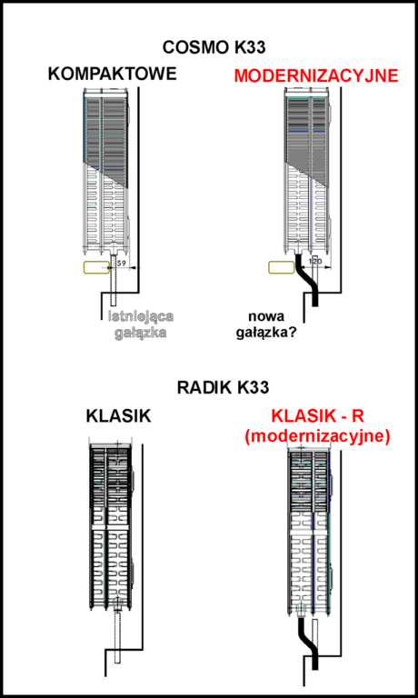 Pytanie do instalatorów, lub osób które wymieniały grzejniki żeliwne na panelowe, ale typu 33 (trzy płyty) Czy orientujecie się dlaczego grzejniki, różnych producentów, ale przeznaczone do modernizacji, mają inaczej umieszczone otwory boczne do podłączenia gałązek niż wersje standardowe? Chodzi mi o odległość osi takiego otworu od tylnej ściany grzejnika a co za tym idzie od ściany (wnęki). Pokazałem to na rysunku. Wydawalao mi się, że wersje modernizacyjne grzejników powinno się zainstalować bez przerabiania gałązek (rozstaw 500mm jest OK) ale gałązki trzeba odginać (w wersji 33)? Zastanawiam się czy ma jakieś znaczenie takie odgięcie i po co one jest tak zrobione w stosunku do wersji standard? No i czy takie podłączenie ma jakiś wpływ na działanie głowicy termostatycznej? W wersjach standardowych przy grzejnikach typ 33 głowica jest prawie schowana w obrysie grzejnika, a w wersjach modernizacyjnych wystaje dość sporo przed przednią płytę? Przecież do typów 33 w wersji standard stosuje się głowice i chyba jest to normalne. -