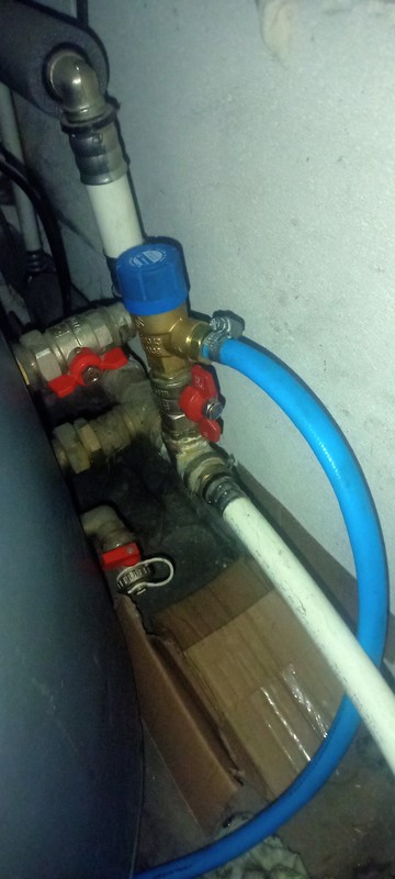 U mnie jest zawór kulowy, za nim zawór zwrotny następnie trójnik z odejściem do bojlera i do naczynia przeponowego. Zaraz za trójnikiem pomiędzy nim a naczyniem jest zawór bezpieczeństwa. Do bojlera idzie pex 16 -