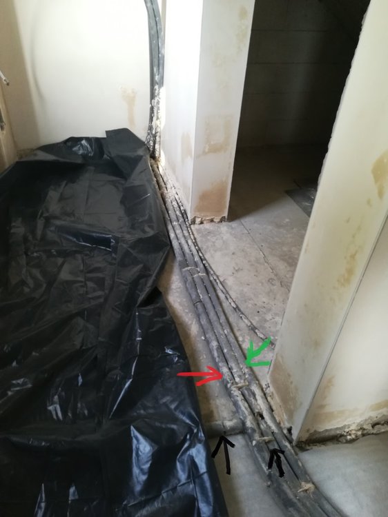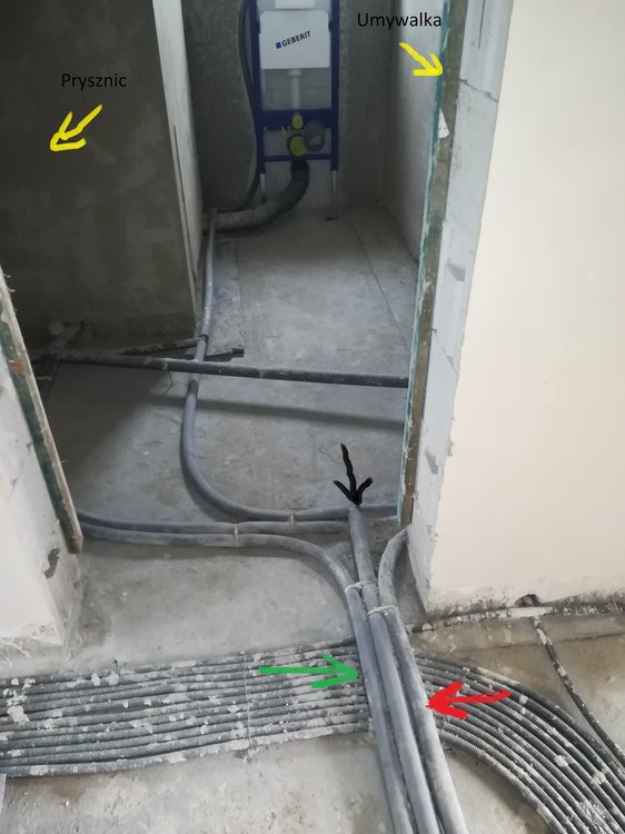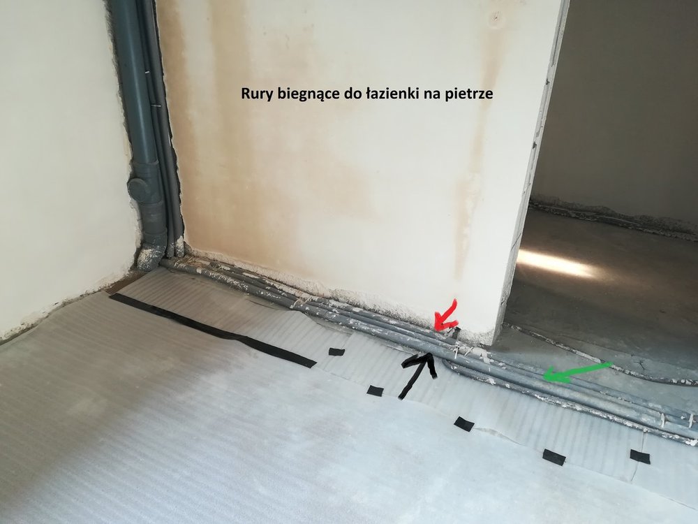 2. Witam wszystkich. Mam mały problem z ciepłą wodą w mojej instalacji. Na razie nie mam założonej pompy cyrkulacyjnej ale mimo wszystko bardzo dziwnie to wszystko działa. Problem polega na tym iż w łazience gdy w umywalce puszczam ciepłą wodę to pojawia się ona po ok 10 sekundach. Zaraz obok jest prysznic i gdy puszczę wodę pod prysznicem to muszę czekać półtorej minuty by zaczęła lecieć ciepła woda. Musi zlecieć z 20L wody by pojawiła się ciepła woda. Podobna sytuacja jest ze zlewem w kuchni. Puszczam wodę , czekam półtorej minuty i zaczyna lecieć ciepła woda. wtedy pod prysznicem po kilku sekundach pojawia się ciepła woda.Taka sama sytuacja jest na odwrót tzn puszczam wodę pod prysznicem i gdy zacznie lecieć ciepła woda to w kuchni również po kilku sekundach się pojawia. Rury które biegną do łazienki na górze są zaślepione bo jeszcze nie ma ma tam gotowej łazienki. Rozmawiałem ze znajomym hydraulikiem i sam był zdziwiony że tak długo muszę czekać na ciepłą wodę. Powiedzial że może prysznic ciagnie wodę z cyrkulacji ale cyrkulację mam przy bojlerze zakręconą. Może wy podpowiecie w czym może być problem? Na zdjęciach zaznaczyłem gdzie jest ciepła i zimna woda i cyrkulacja oraz zaznaczyłem gdzie jest jakie pomieszczenie. Czerwona strzałka to ciepła woda czarna to zimna woda a zielona to cyrkulacja.