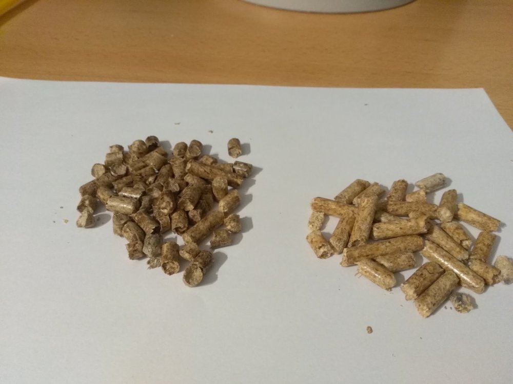 Trochę już jestem spóźniony z kupnem pelletu, bo już powiało delikatnie chłodkiem i ceny idą w górę. Miałem sobie kupić 1 tonę tego ukraińskiego co wcześniej kupiłem na próbę, ale co widzę cena poszła o 100 zł to góry i wynosi 850 zł/t. Ogólnie Ukraina się pali, ale dość dużo spieków . Wyszukałem niedaleko mnie dość duży zakład produkcyjny pelletu i brykietu. Widzę że bardzo dużo pakują na eksport. To sobie kupiłem 1 t, można powiedzieć, że prosto z produkcji, cena dość wysoka 950 zł/t. Powiedzieli, że 100 % z drzew iglastych (produkują też mix ) no i chyba miał rację. Poniżej zrobiłem kilka fotek porównując go do ukraińskiego. Ten nowy po prawej stronie. Jak spalę do końca ukraiński, to zasypię 150 kg tego nowego i zobaczę, czy jest jakaś różnica. Tak na wygląd i macanie, to jest jaśniejszy i po rozpuszczeniu w wodzie w dotyku grubszy.