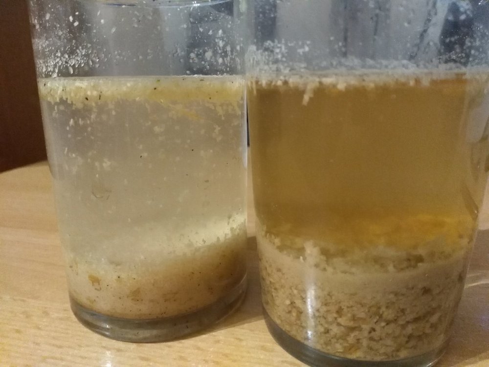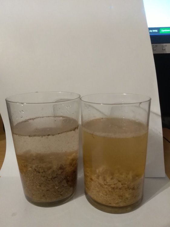 Kolego tutaj masz rację z tym nierozpuszczaniem tych żywic. Przeprowadziłem prosty test. Można powiedzieć że narobiłem piłką trochę trocin z suchego kawałka sosny i wlałem wody i tutaj masz rację, jak by nie te małe kawałki trocin, to woda była by jak kryształ, ale zauważ że moje trociny są jednorodne (taki sam wymiar). W kupionym , są różnego kalibru, co widać na fotce. Ku samej górze osiadł się dosłownie pył. Tego tak dobrze nie widać na zdjęciu, ale w wodzie pływają bardzo malutkie kawałeczki i może to robi złudzenie zabarwienia.