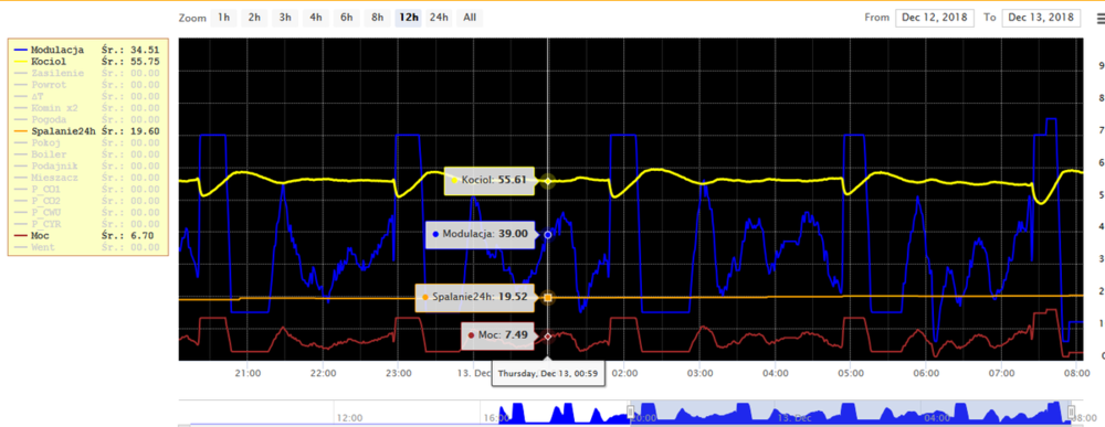 @Michaelkw-tak na szybko,z tego co widzę po Twoich wykresach-dużo tracisz na powrocie tzn.wydaje mi się że masz za dużą deltę,różnicę temp między zasilaniem a powrotem,bo coś ok 6st średnio.Kocioł Ci "pływa"(to takie moje określenie)-ma dużą bezwładność,szczególnie,że masz przewymiarowany,bo 50kW..Nie jestem ekspertem i już rzadko zaglądam na forum ale ,wydaje mi się ,że graniczna delta nie powinna przekraczać 3 st.(poprawcie,jeśli się mylę).Powyżej tego dużo energii idzie na dogrzanie powrotu(a tym samym na uzyskanie temp zadanej kotła)..Na Twoim miejscu zainteresowałbym się tym tematem-ochroną powrotu,można to zrobić na wiele sposobów,znajdziesz na forum. Ja zrobiłem to w chamski sposób wstawiając na baypassie z zasilenia,niepotrzebną pompkę cyrkulacyjną i...pomogło i działa już drugi sezon. -
