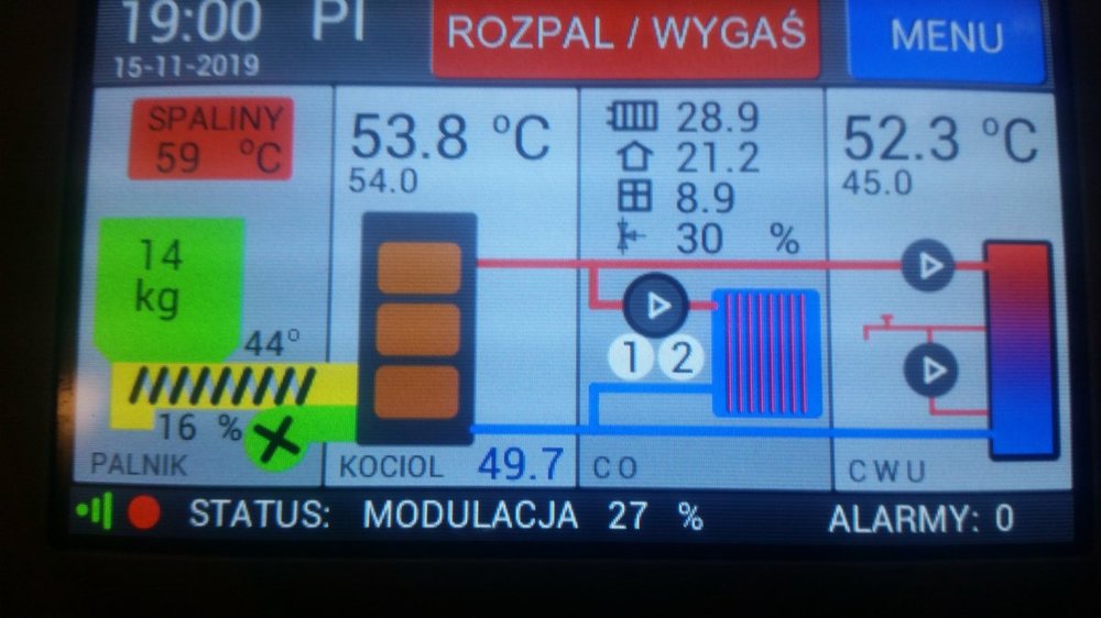 @jolo747 "inżynierze" nie pisz tak dużo, bo oczy bolą. :) Po to kupiłem SKZP, żeby cały czas modulował !(JA) "Dwustanowałem" przez kilka lat i cieszę się, że juz tego nie robię. Tak wygląda mój wykres. Kocioł trochę brudny, nie czyszczony 3 tygodnie. A kolegi @bercus nie prowokuj, bo też dzięki niemu - ja sem zadowoloni :)) Pozdrawiam Modulatorów. -