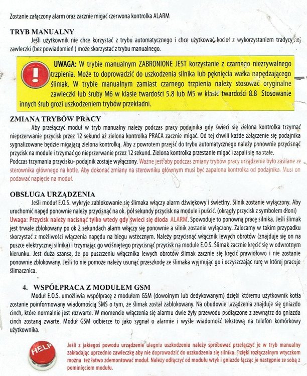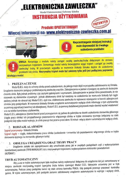 Mam ten wynalazek "elektroniczną zawleczkę". Kolega @gmaj22 dobrze pisze, że jest możliwość powiadomienia sms-em(dodatkowy moduł). Kiedy ślimak natrafi na tę "śrubę" :) cofa go bodajże 3 razy tył-przód, a gdy nic to nie daje, wyłącza podajnik i piszczy. -