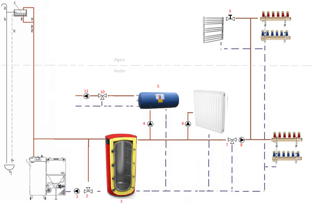 Dziekuję :-) Poszukałem przykładowej aplikacji i faktycznie jest inaczej. Poprawiłem na nowym schemacie. Zasobnik CWU wyrzuciłem przed bufor aby nie było potrzeby grzania bufora w lecie tak jak było pisane wcześniej. Dołożyłem elektrozawór (12) który będzie sterowany wraz z pompą CO (6) oraz podłogówki (8) prawdopodobnie przez jakiś stycznik aby cały obieg bufor + reszta był wyłączony gdy w piecu będzie wybrany tryb letni. Siłowniki na mieszaczu w dalszym ciągu chciałbym sterować przy pomocy regulatora pokojowego (nawet jeśli steruje stykiem bezpotencjałowym) gdyż termostat jest już kupiony i chciałbym go wykorzystać. Poza tym umożliwia wybór histerezy 0,5 stopnia co być może okaże wystarczające. Jeśli nie, to zaopatrzę się w termostat PWM lub zlikwiduję regulator a siłowniki na mieszaczu wymienię na zwykłe głowice. Dlatego w przypadku jeśli wszystkie pętle będą zamknięte i otworzy się chociażby jedna to normalnie mogłoby to spowodować rozpalanie pieca, a tak będzie bufor który wcale nie musi być duży a znacząco poprawi bezwładność ogrzewania. Zawór 3D mieszacza podłogowego (7) będzie sterowany sterownikiem pogodowym. Grzejnik łazienkowy który nie jest tu ujęty będzie podpięty w obiegu CO (pompa 6). Niestety trzeba będzie dołożyć trochę dodatkowych rur ale skoro trzeba to trzeba. W obiegu CO i CWU (4 i 6) będą dołożone zawory zwrotne ustawione w kierunku odbiornika aby przy wyłączonej pompce nie występował niepożądany przepływ. Nie mam pomysłu jeszcze na pompę kotłową (1) czy ma chodzić stale 24h na dobę czy jakoś nią sterować. Być może wybrany piec (jak już go wybiorę) będzie miał taką możliwość. Czy macie jeszcze jakieś pomysły na dodatkową armaturę którą warto wykorzystać? Filtry itp, itd...- 44 odpowiedzi