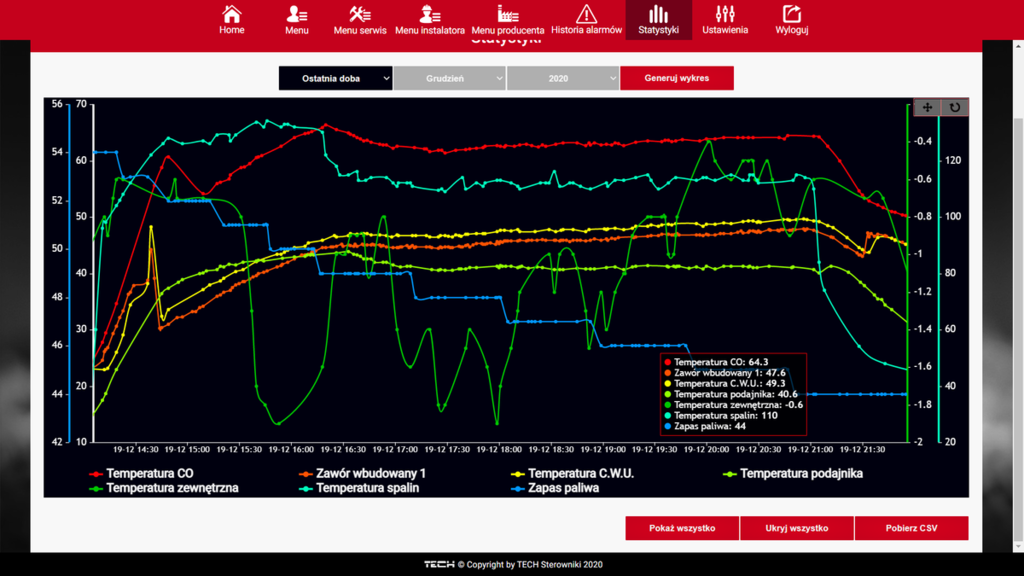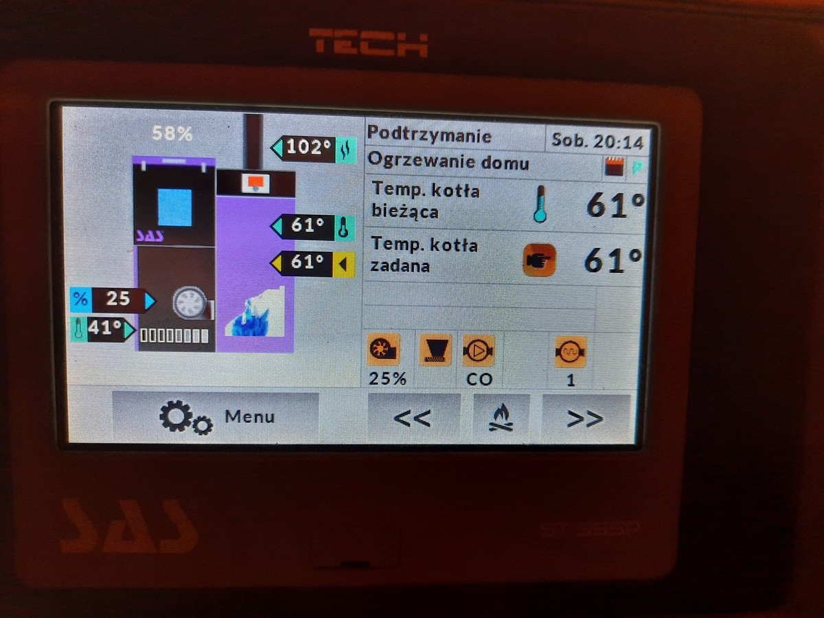 Kocioł pracuje w manualu na następujących ustawieniach: Praca: podawanie 3 / przerwa 25 / nadmuch 20% Podtrzymanie: podawanie 1 / przerwa 20 / nadmuch 20% (czas nadmuchu: praca 35 / przerwa 10 )