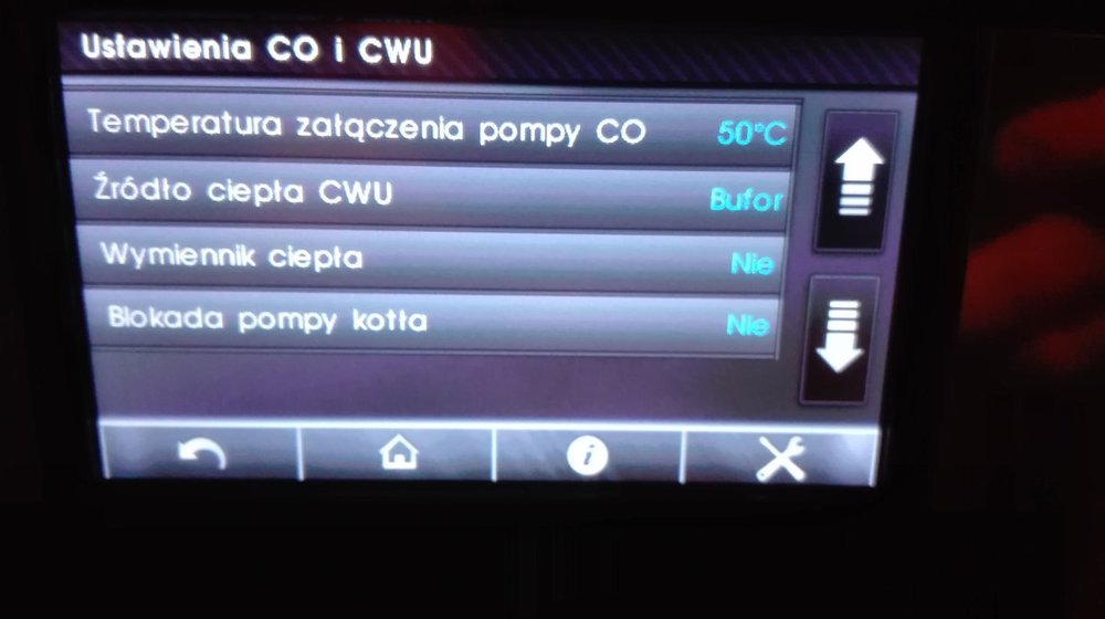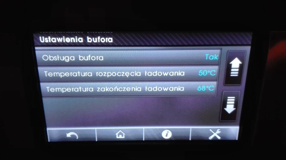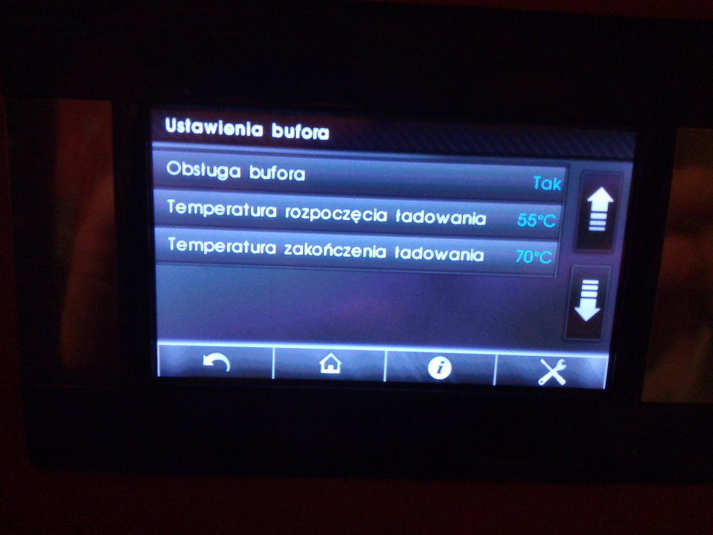 Po weekendzie mogę powiedzieć tak: mój kociołek nie jest w stanie nagrzać bufora do temperatury większej niż 73 stopnie. Jakie ustawienia ładowania bufora, temperatury zadanej kotła oraz histerezy mam wprowadzić żeby po załadowaniu tego bufora się po prostu wyłączył... Dodam że mam teraz ustawienia takie: temp. zadana kotła 75, ładowanie bufora od 45 do 68 stopni, histereza 50% - 1st histereza, 30% - 2st. Na tych ustawieniach po załadowaniu bufora kocioł się nie wyłącza. Co muszę sprawdzić, co pozmieniać?? Jak ustawić żeby pompa w kotle nawet na postoju pracowała na okrągło, chodzi mi o to żeby cały czas mieszało wodę w buforze bo jak stoi to kaloryfery mam chłodne... Cały osprzęt do podłogówki z pompami jest za buforem...