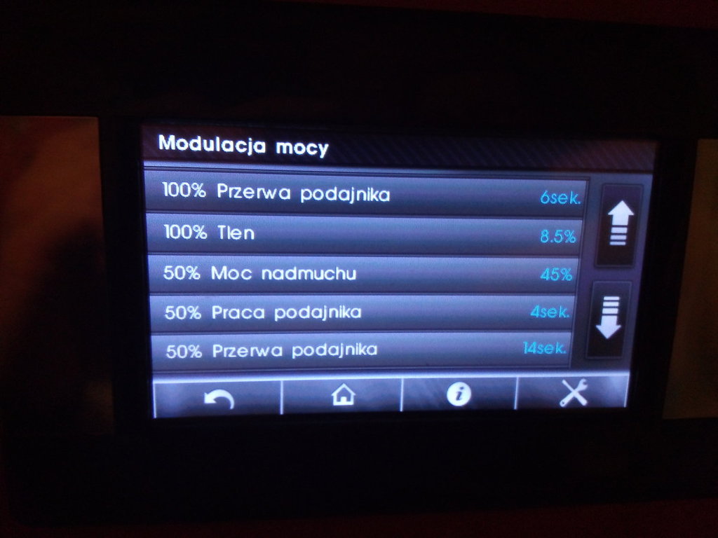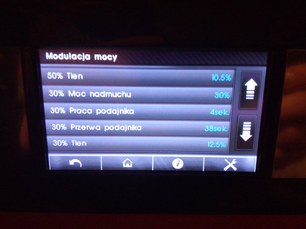 Moje ustawienia to: 100% nadmuch 62%, podajnik 8s, przerwa 14s 50% nadmuch 46%, podajnik 6s, przerwa 26s 30% nadmuch 30%, podajnik 4s, przerwa 39s histereza h2 - 17 histereza h1 - 8 histereza kotła - 15 czyszczenie kotła co 4 goziny, praca z harmonogramem 3 x 4 godziny w odstępach po 4 godziny Pogodówke mam wyłączoną, sonda zbija mi moc nadmuchu o 22%, przy womixie mówili mi żeby pogodówki nie montować.
