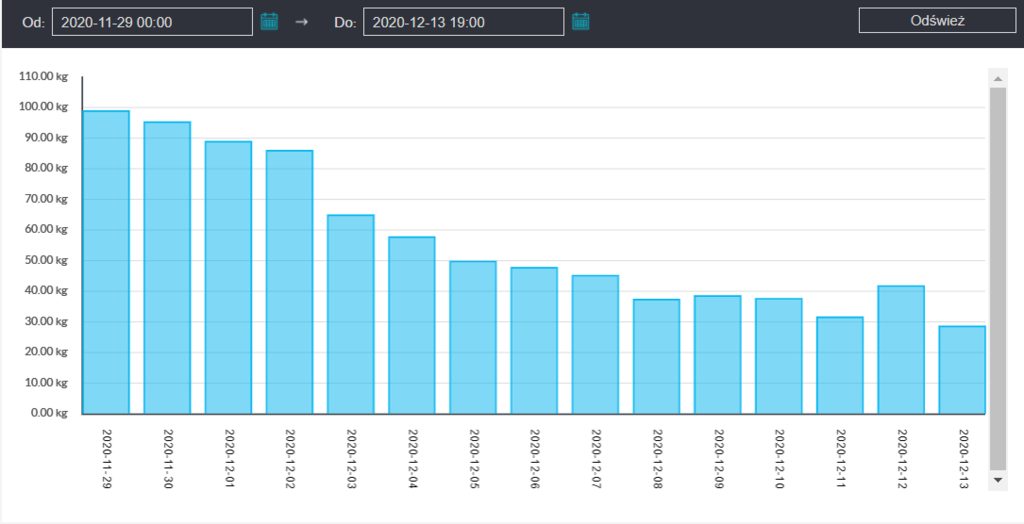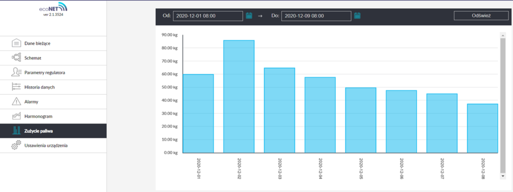 Jesteśmy po kilku dniach pracy po naszej weryfikacji. Jak widać na wykresie poniżej spalanie już spadło o ponad połowę przy niższych niż wcześniej temperaturach zewnętrznych: Na chwilę obecną nastawiliśmy prawidłowe ustawienia, został wykonany test podajnika. Dzisiaj Klient zamontuje czujnik pogodowy, tak aby móc sterować siłownikiem zaworu mieszającego na podstawie temperatury zewnętrznej. Jeszcze kilka dni pracy przed nami ale jesteśmy już ustawieni w dobrym kierunku. Nie zapominajmy o tym, że jest to nowy budynek, jeszcze z nie wygrzanymi ścianami i podłogami, no i również nieocieplonym dachem. Pozdrawiam, Jakub Wroński. -