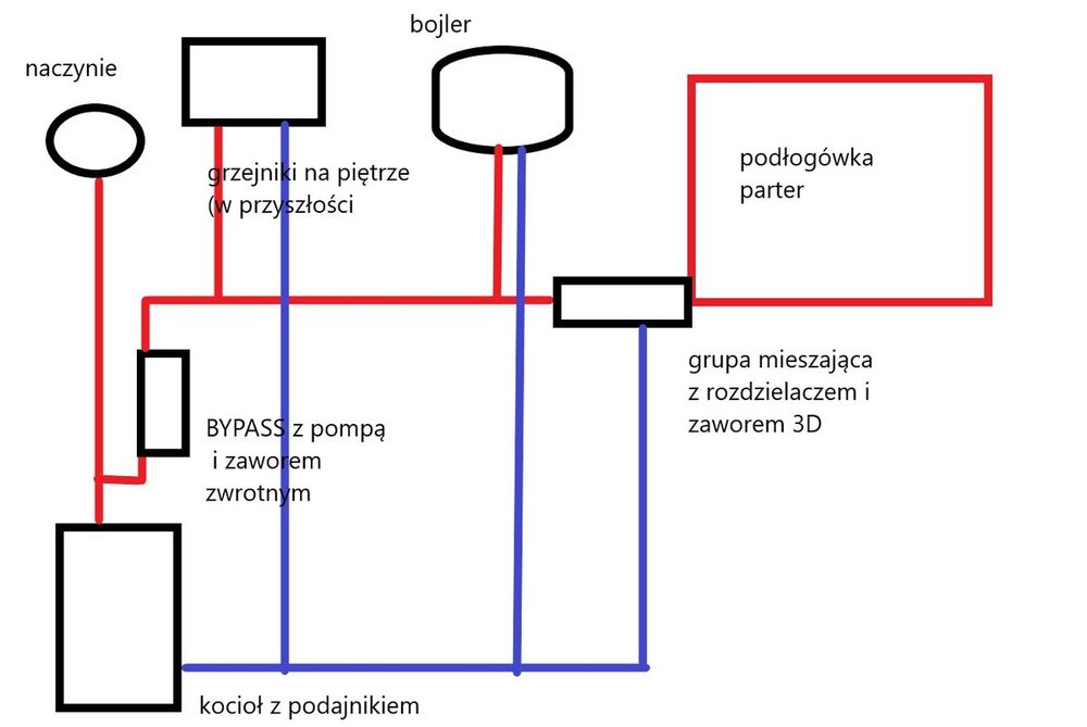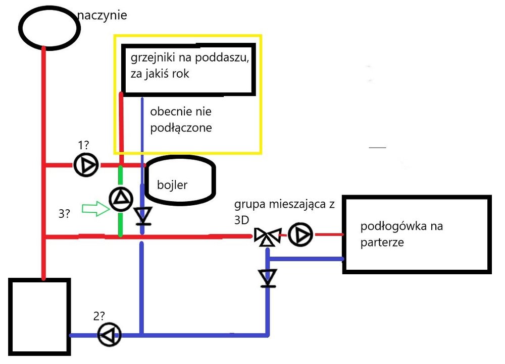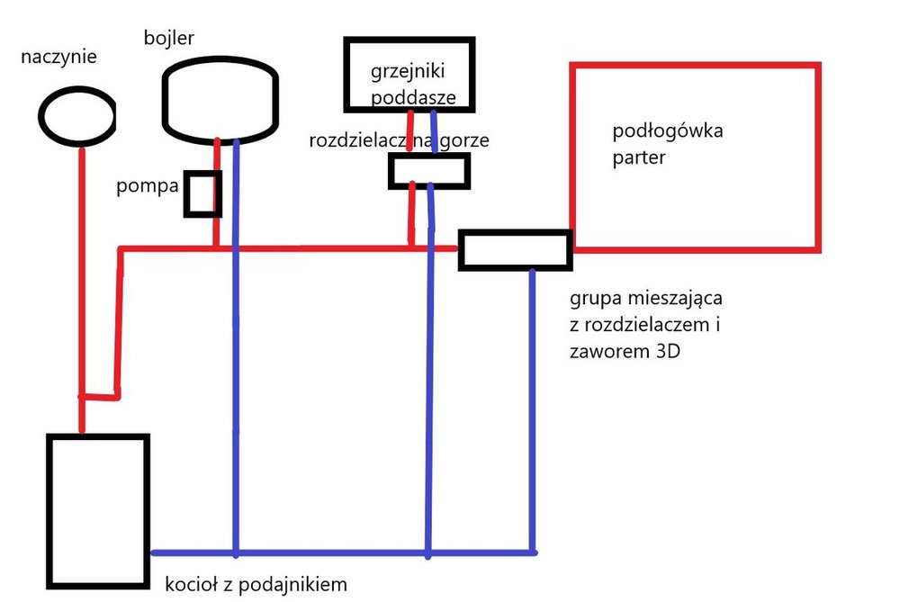 Właśnie o tym myślałem, żeby ewentualnie uniknąć dodatkowej pompy kotłowej ze schematu Odpowietrznika, zasilanie bojlera potraktować jako mieszanie zimnego powrotu, tak jak wspomniałeś. Bojler docelowo jest przewidziany w pomieszczeniu odsuniętym od pieca o ok 7m. ( tak mam rzucone rurki w posadzce do CWU). Póki co, jeszcze bojler mógłbym przenieść do kotłowni, żeby zmniejszyć odległość od pieca, przez co krążąca woda ociepli powrót do pieca. Najwyżej samą CWU puszcze w dobrej otulinie te parę metrów do tego wcześniejszego pomieszczenia. Czy w tej sytuacji mogę zastosować rozwiązanie zbliżone do tego schematu który zamieściłem? Jedna pompa przy piecu, zasilająca bojler, druga na rozdzielaczu od podłogówki, a poddasze w przyszłości na osobnym rozdzielaczu z zasilaniem podpiętym już za bojlerem a przed podłogówką? Czy coś takiego miałoby rację bytu? Schemat Odpowietrznika jest pomocny, bo trochę mi podpowiedział, ale chciałbym uniknąć zbyt wielu pomp -