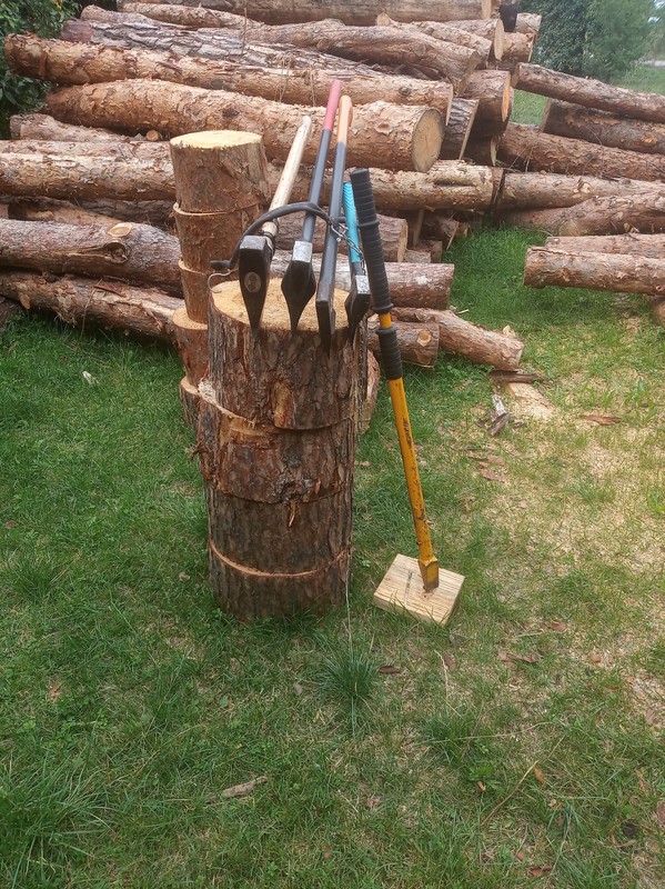Jakby łupiarki zawiodły lub nie było prądu, polecam taki sposób rąbania: Idzie szybko i nie trzeba się schylać za spadającymi klockami oszczędzając kręgosłup.