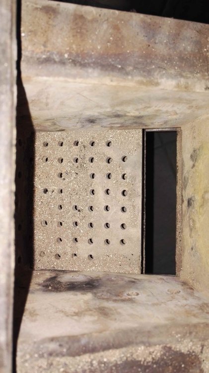 15. Czyli wygląda na to, że w nowszej wersji to poprawili, tak, jak mi się wydawało, że powinno być. Jedyne to, co ta blacha przytwierdzona jest do drugiej strony paleniska (odwrotnie niż to narysowałem). U mnie wygląda to tak (uchylona szufladka): Z kolei ręcznie jestem jeszcze w stanie wybrać tyle popiołu, jak na zdjęciu poniżej. Nie jest go bardzo dużo, ale trochę jest. Jak patrzyłem, popiół wydmuchuje się maksymalnie na ok. 1cm od 'rusztu'. Spojrzałem już w momencie rozpalania, a przed zasypaniem.