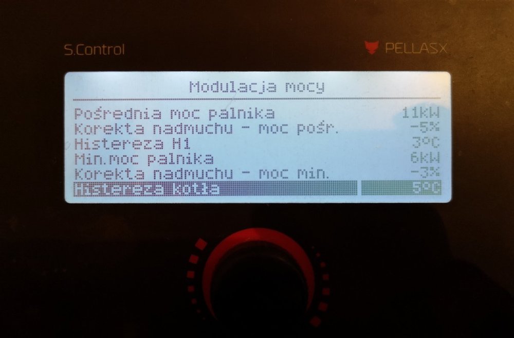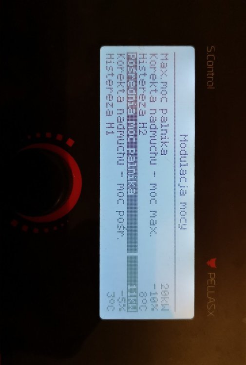 Myślałem że po to jest info w profilu :) Co ogrzewam? Dom 190m2. Budownictwo l Z lat 80. Półtora pustaka z szczeliną ocieplone 6cm styropianem oraz 12cm sryropianu strop. Instalacja 11 grzejników, stara instalacja grawitacyjna, zawór 3d, cwu 300l Kocioł Galmet Genesis KPP plus 20kw, palnik pellasx26kw revo mini Spala mi o obecnie ok 35-40 kg. Palę Olczykiem. Zawór 3d w funkcji rozdzielajacej jako ochrona powrorotu. Na powrocie około 52-54 stopnie po nagrzaniu kotła. Regulator pokojowy tech 292 v2 ustawione w dzień 21,8 a na noc 21,2. Wyłącza kocioł po osiągnięciu ww. temp. Zrobiona "zetka" w kotlowi oraz zainstalowany RCK Darko Temp. spalin ok 120 Temp zad. kotła 65 tryb standard Temp zad. CWU 45 histereza 3 na priorytecie. Zużycie duże 10 osób. Pellet ponownie dzisiaj przewarzylem i wyszło podawanie 10,5 kg/h. miesiąc wcześniej bylo 12 kg/h na tej samej partii, więc nie wiem skąd takie różnice. Kaloryczność ustawiona 5.1 Ustawienie modulacji poniżej na foto. -