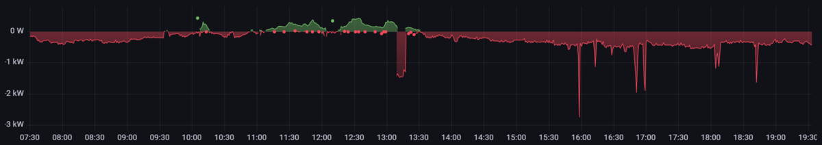 Dla tych co zastanawiają się ile produkuje PV w pochmurne grudniowe dni: wycinek dnia: Powyżej bilans domu jednorodzinnego. Czerwone to zużycie (pobór z sieci), zielone to produkcja większa niż pobór domu (czyli bilans na +) Ogólnie jedno wielkie g... 😁 Wyobraźmy sobie teraz offgrid. Tutaj dobowe zużycie wahało się między 8, a 12kWh doba. -