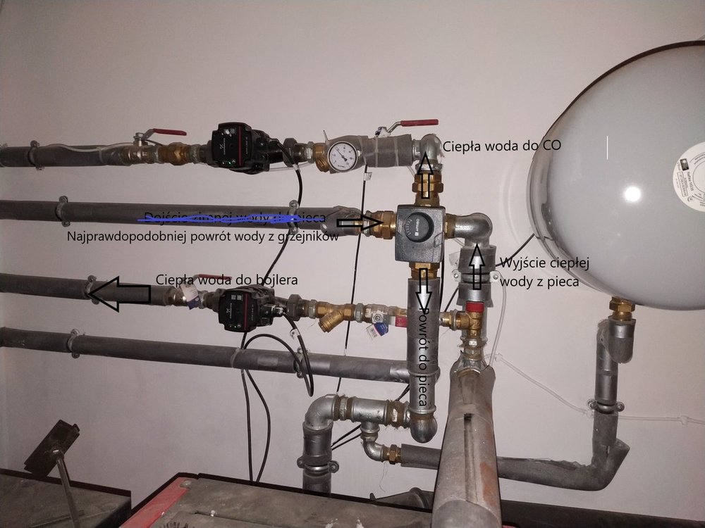 17. OP jest tka zrobione, że jest tylko w kuchni i w takiej skrzynce jest takie pokrętło jak przy grzejnikach. Staram się nie bagatelizować opisu ale sytuacja jest taka. Z pieca wychodzi rura z ciepłą wodą do zaworu czterodrożnego, tam jest ten mieszacz z siłownikiem Afriso. Stamtąd idzie woda do grejników (w tym podłogówki). Z lewej strony przychodzi powrót z grzejników. No i jeszcze jest jedno wyjście na powrót do pieca. Minimalna temperatura powrotu jest ustawiona na 50 C. Mogę zakręcić podłogówkę i zo baczyć jak jest na grejnikach z wiekszą temperaturą, zobaczymy co się stanie. Tylko nie bedzie wtedy tak, że piec osiągnie temperature zadaną albo termostat go wyłączy i wyższa temperatura na mieszaczu szybciej ten piec wychłodzi? Nie powinno być tak ,że jak termsotat rozłoczy styki to grzejniki powinny być zimne, to znaczy zawór mieszający powinien odciąć dopływ do grzejników?