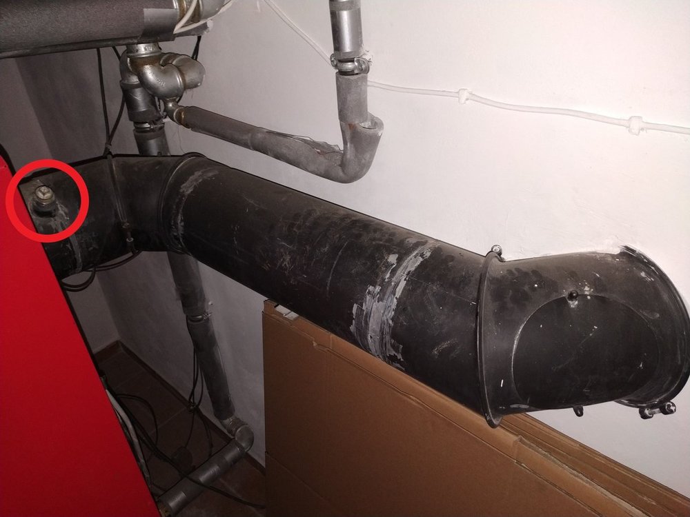 22. Załączam zdjęcie tego co mam za piecem i tam raczej nic takiego jak RCK nie ma, jedyne coś czym można kręcić zaznaczyłem czerwonym kółkiem. W kominie dymnym od pieca nie ma nic więcej oraz zakończenie na kominie wydaje się być zwykła rurą. Dla przykładu gdy piec dobijał do temperatury zadanej moc obniżyła się do 4,5KW a temp. spalin była 110 C. Przy pełnej mocy teraz ustawionej czyli 15 KW temp. spalin to 180 C. Czy to może wpływać na ilośc spalonego pelletu?
