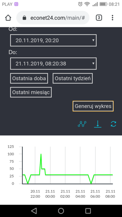 Ok, kociol SF22 z sonda, 180m do ogrzania, same grzejniki, ustawienia serisowe załączam, historia z ostatnich 12 godzin, pracuje na najnizszej mocy tylko jak grzeje cwu to wchodzi wyzej. Temperatura na mieszaczu 36 stopni. Jestem zadowolony z pracy tylko troszke tlen mnie martwi bo dochodzi do 16,2 ale chyba to wina ciagu bo mam komin 12,5mb.