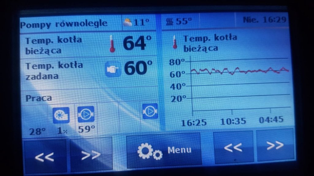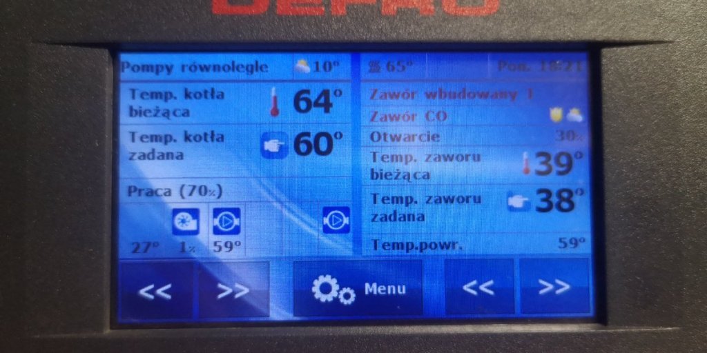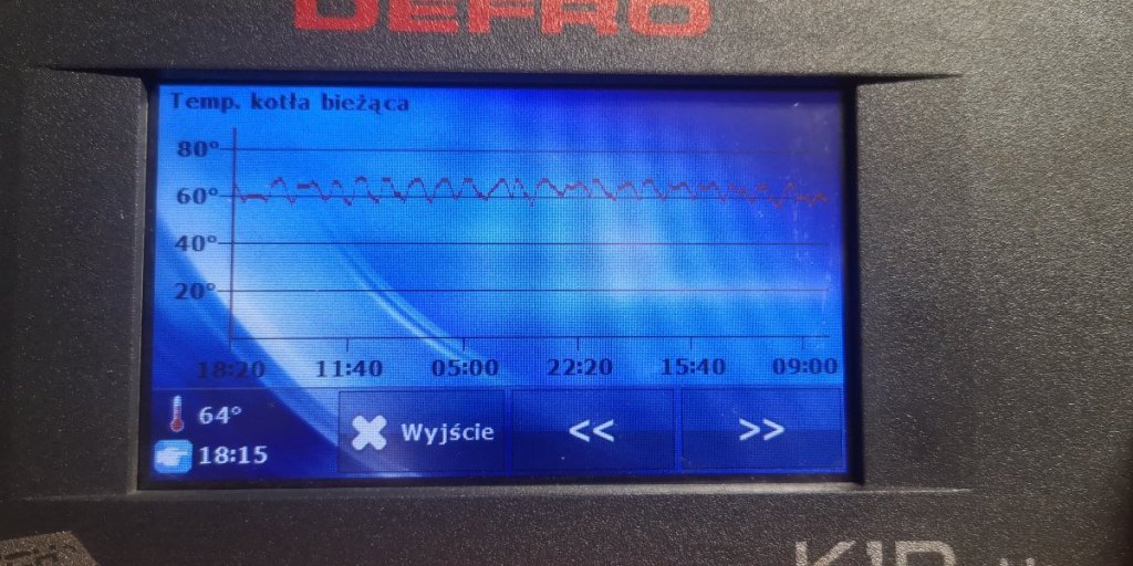Moje obserwacje są co najmniej dziwne, jak się teraz zachowuje kocioł: dobija do 66C włącza się nadzór, potem spada na 64C włącza się praca (70%) i na ikonie wentylatora 1%, w przeciągu ok 5min potrafi spaść do 58C -> zadana 60C. W ciągu tych 5 min zaczyna powoli rosnąc % przy wentylatorze, ale nadmuchu nie słychać, dochodzi do 53% teraz jak stałem obok niego włączył się przedmuch, zmieniła się wartość na 50% (siłą nadmuchu w przedmuchu) ewidentnie było słychać że włączył się wentylator po czym zmieniło się 53% i wentylator znowu się wyłączył. W momencie jak spadło na 58C na ikonie wentylatora było 66% i dopiero delikatnie było słychać pracę wentylatora, czyli już ma 2C poniżej zadanej a on dalej dmucha ledwo co. Potem znowu jak osiągnie 60C to bardzo powoli zaczyna schodzić w dół aż znowu przebije 65C.