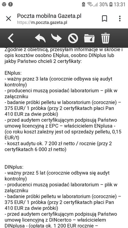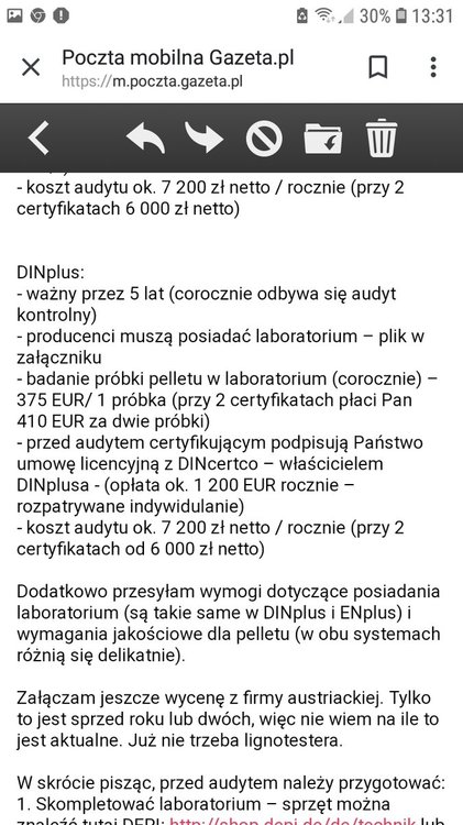 To po co kupujecie pellet bez certyfikatu,bo chcecie taniej.Jesli nie wierzycie no name to nie kupujcie... Każdy chce certyfikatu A tak naprawdę nie ma pojęcia jaki jest tego koszt.Czemu producent ma brać na sb ten koszt . No to proste że ten pellet będzie droższy. Problem leży w tym w jaki sposób jest przyznawany ten papierek niech nie nakładają opłat tylko certyfikuja od jakości danego produktu.Od razu by się zrobił porządek na rynku. Przykładowo jestem producentem dzwoni klijent I pyta czy mam certyfikat ,no ja nie mam (nie stać mnie na taki koszt), to się pytam :przprzecież jest na rynku pellet z certyfikatem to nie problem znaleźć. No ale wiadomo jaka odpowiedź ZA DROGIE .