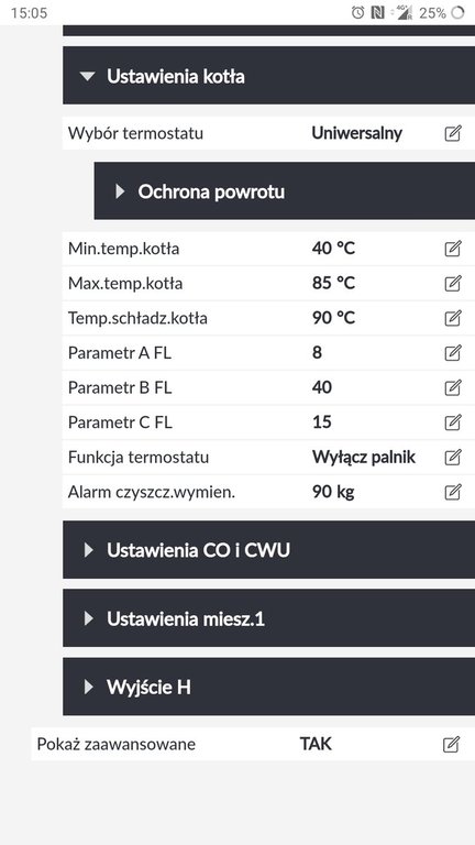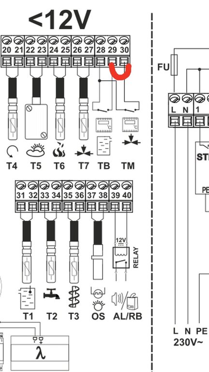 A więc udało mi się wysterować uniwersalnym termostatem pokojowym zarówno kocioł jak i mieszacz. Wystarczy podłączyć go do zacisków kotła (28,29), założyć zworkę pomiędzy 29 i 30 i w ustawieniach serwisowych włączyć termostaty. Teraz gdy temperatura w domu zostanie osiągnięta termostat wyłącza palnik, pompa nadal pracuje a mieszacz obniża temperaturę.