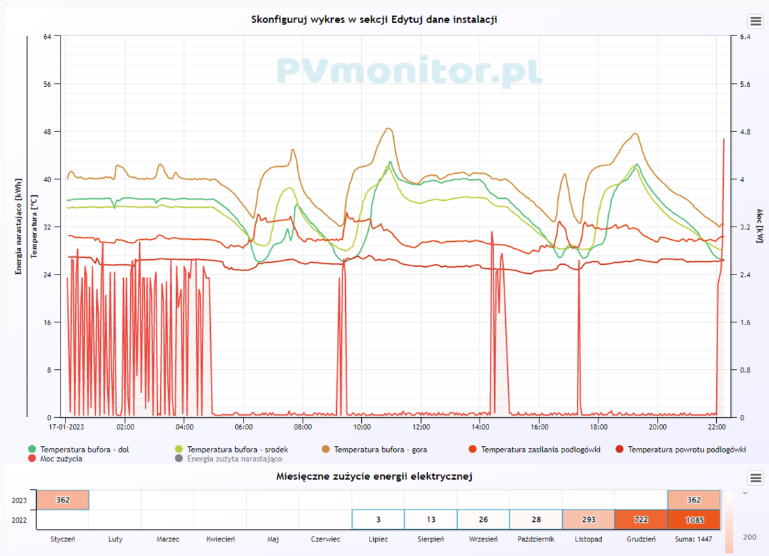 Przy tej temperaturze ustaw w taniej taryfie o 5* wyższą niż na zasilaniu, a w drogiej równą z zasilaniem. Tylko temperaturę byś musiał mierzyć przy wyjściu z bufora na instalację. Koło samej grzałki zawsze jest trochę wyższa. U mnie dzisiaj tak to się rozłożyło. Te wyższe piki temperatury to kocioł gazowy, który włącza się w drogiej taryfie prądu, jak brakuje energii w buforze. Dzisiaj poszło mi 7kWh prądu i 1m3 gazu na CO i CWU.