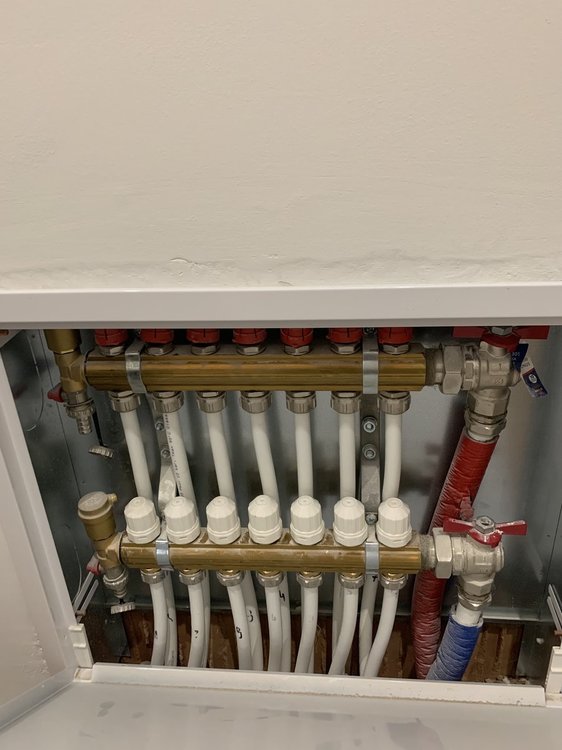 2. Witam, przeprowadziliśmy się niedawno do naszego domu. W 100% mamy ogrzewanie podłogowe. Dom piętrowy, powierzchnia do ogrzania ok 220m2. Problem jest następujący - w części pomieszczeń jest po prostu zimno. Podłoga jest zimna. Partacz, który wykonywał instalację nie zostawił ani projektu, ani chociaż informacji która sekcja odpowiada któremu numerowi na rozdzielaczu. Nie mam informacji jak długie są pojedyncze pętle, mogę się domyślać, że jedna zasila powierzchnię max 20m2. Podejrzewam, że problemem jest zbyt słaba pompa. Ciągniemy cały dom na jednej, fabrycznej pompce wbudowanej w kocioł (immergas victrix tera 24plus), wyczytałem w dokumentacji że ma moc 40w. Po organoleptycznym zbadaniu rozdzielaczy stwierdzam, że różnica temperatur (góra-dół) jest dosyć spora, a dolna partia (powrót) wysunięta najdalej od zasilania prawie zupełnie zimna. Poniżej foto jak wygląda rozdzielacz na piętrze. Parter wygląda tak samo. Pytanie - jakie są możliwe przyczyny niedogrzewania niektórych pomieszczeń i jakie są ewentualne sposoby naprawy? Z góry wielkie dzięki za pomoc.