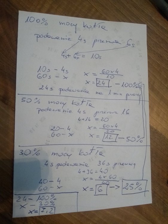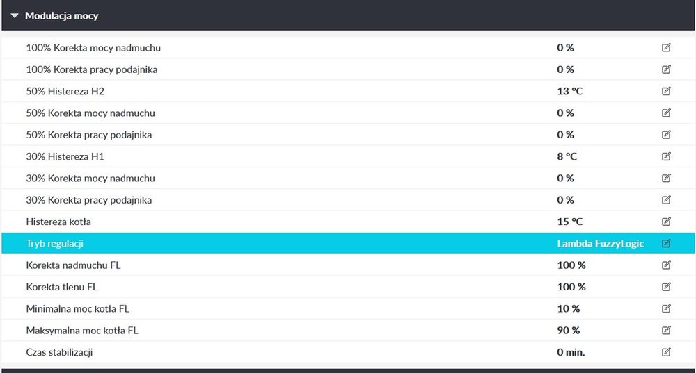 Ja mam ustawione na mocy 30% podawanie 2 s przerwę 17 nadmuch po korekcie sondy w okolicach 20%. dzięki tej operacji tlen nie przekracza 13%. W październiku około 480 kg spaliłem. Ogrzewam 200 metrów do temp 22(12 grzejników aluminiowych z głowicami termostatycznymi) i 60 metrów do temp 15 stopni(4 grzejniki i 4 drabinki). CWU 550l głównie przez kolektory słoneczne ale kilka razy piec dogrzewał jak nie było słońca. Przy fabrycznych ustawieniach 30%mocy 4/42 piec przeskakiwał na 50% mocy i tlen w granicach 15%. Teraz na 2/17 po ustabilizowaniu się temperatury w picu i sprzęgle hydraulicznym chodzi tylko na 30 %