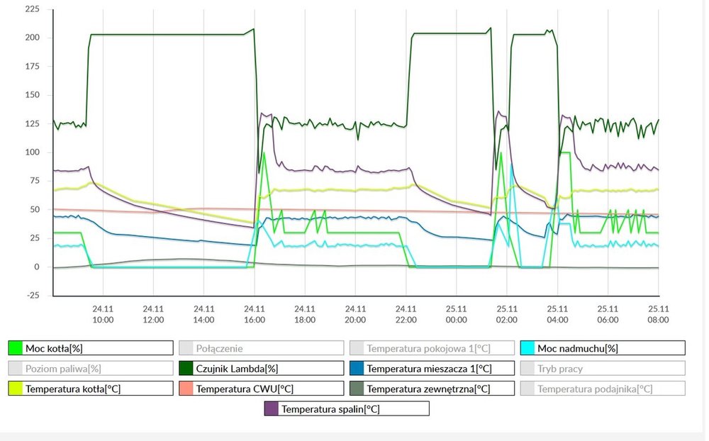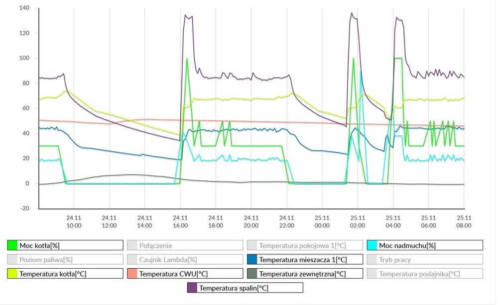 Witam Miałem trochę czasu przez weekend i poobserwowałem piec. Okazuje się że problem z grzaniem CWU po osiągnięciu temperatury zadanej na termostacie w domu nie został rozwiązany. To wyłączenie pompy CO jednak nie działa piec rozpala się dochodzi do zadanej i gaśnie jedynym wyjściem jest wyłączenie blokady kotła od termostatu. Będę pisał do Lazara czy można to jakoś inaczej rozwiązać. Poniżej wykeresy z ostatniej doby.