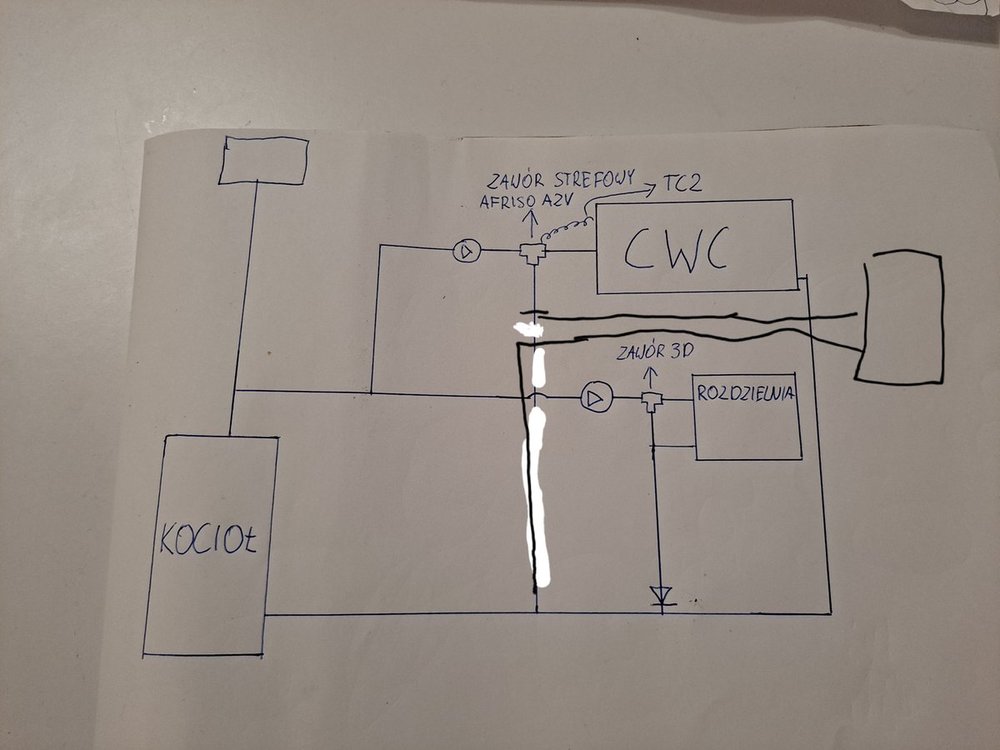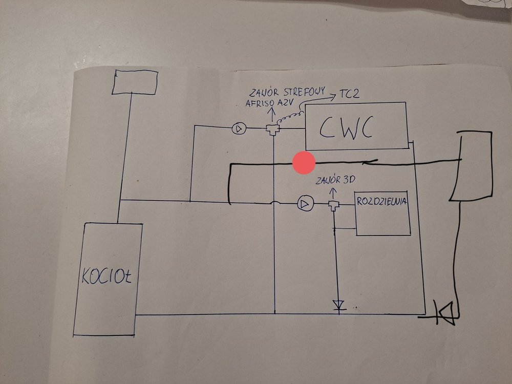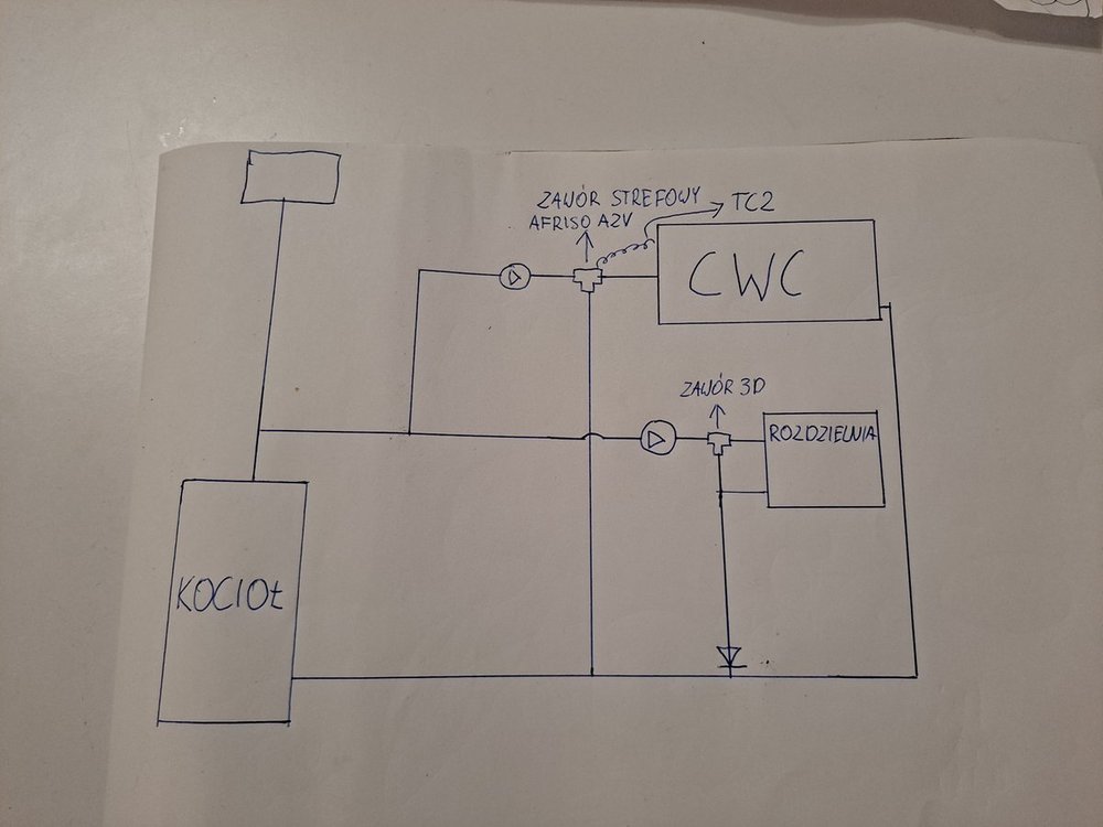 Tutaj wykorzystujesz zawor strefowy AZV ktory jest sterowany termostatem TC2 . Zawor ten zmienia kierunek przepływu wody dlatego daje się go za pompa . A termostat tc2 steruje zaworem . To znaczy kiedy jest zimniejsza woda w CWU to TC 2 wysyla sygnal do azv a ten otwiera się na obieg CWU, zaś kiedy CWU jest dogrzane to zawor się otwiera na bajpas, ktory ogrzewa powrót:)