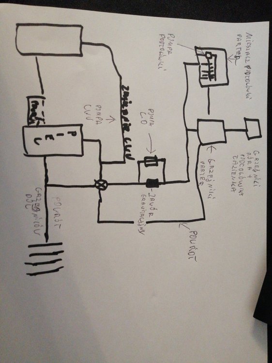 Na szybkosci zlepiony schemat... Na calej istalcji przy piecu jest jeden odpowietrznik i to na zasilaniu cwu brak na CO, nie ma zadnego zaworu zwrotnego sa zwykle zawory kulowe. Dodatkowo jest 3 obieg . Sorki za amatorski schemat nie znam profesjonalnych oznaczen -