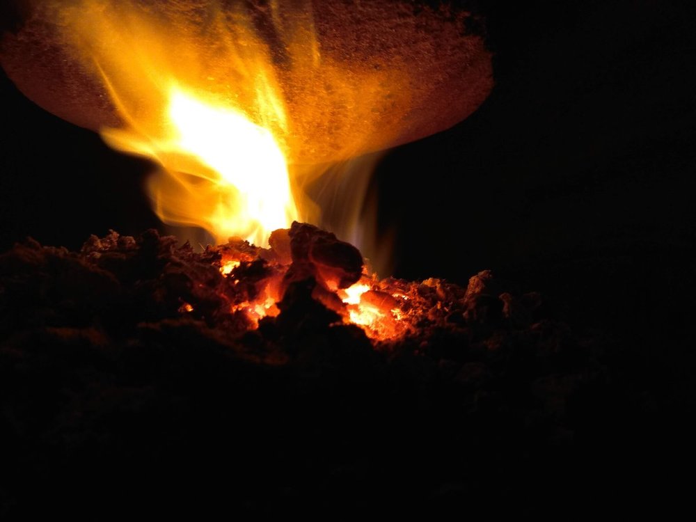 Na tym zdjęciu palnika widać iskry. To taki węgiel, czy tak dmucha? Ciężko ocenić "siłę" ognia na zdjęciu. Widzę na nim też posklejany węgiel. Ale to może być wynik bardzo mocnego rozgrzania węgla a potem jego schłodzenie. Tak pomiędzy 20-25 to wentylator mocno ci przyspiesza? Spróbuj tak ustawić jak podałeś. Nic przecież to cię nie kosztuje. Chodzi o to, by zmniejszyć wzrost powietrza przy zmianie modulacji. Efekt może być taki, że nie dopali ci węgla, ale w pierwszej kolejności trzeba ustabilizować pracę. Zapas na modulację masz, bo maks na wykresach to ok 70%. Potem można trochę ograniczyć palnik A co kopcenia, to problem może być taki, że masz na retorcie dużo rozgrzanego węgla, a potem nagle powietrze wali na łeb i chodzi na minimum. Nie ma mowy, żeby to się dobrze spalało. Wysokości kopczyka nie ocenię z tego zdjęcia. Zakładam, że jest ok. -