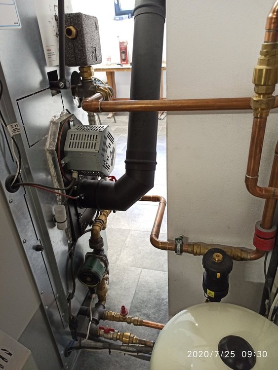 To co wygląda na reduktor to akurat zawór zwrotny z zaworem odcinającym i manometrem (zabudowany zgodnie z przepływem). Ad. 2 Grupa bezpieczeństwa (zawór bezp., manometr i odpowietrznik automatyczny) zabudowany jest bezpośrednio za kotłem na "wysokim" parametrze. Na powrocie zabudowany jest separator zanieczyszczeń z magnesem.