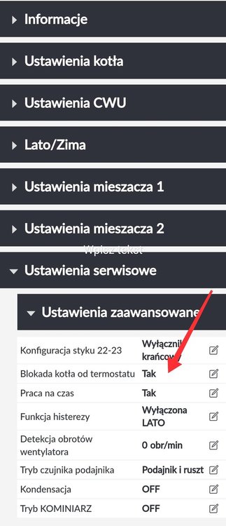 @elmarko niżej masz podgląd na moje ustawienia. Zaznaczyłem, które wg. mnie są istotne aby zmusić kocioł do pracy wg stanu styków termostatów pokojowych. Przy tych ustawieniach kocioł działa wg schematu jak nizej: pomieszczenie nagrzane-->styk rozwarty-->pompa obiegu + pompa kotła się zatrzymuje - -> kocioł od razu przechodzi w Nadzór, niezależnie od jego aktualnej temperatury. Jeżeli chodzi o rozpalanie, możesz ustawić dowolną histerezę temp. kotła, ten odpali ZAWSZE jeżeli jego temp spadnie poniżej 60°C, chyba że sterujesz termostatem wg sposobu który opisałem wyżej. Nieczułość mieszacza to nic innego jak różnica pomiędzy temperaturą zadaną, jaką mieszacz ma utrzymać względem temperatury zmierzonej. Im niższa wartość nastawisz tym mieszacz będzie częściej pracował żeby zbliżyć się do temp. która zadałeś. Serwis ustawia koło 1,5°C, u mnie przy ogrzewaniu podłogowym wartość zmniejszyłem do 1st. @himen92 Przy obecnych temperaturach taki. Dodatkowo ja zwiększyłbym histerezę do 1st.C, odrobinę ograniczy możliwość niepotrzebnego rozpalenia kotła w sytuacji kiedy ktoś np. otworzy drzwi i czujnik zarejestruje chwilowy spadek temp. Sprawdź ustawienia blokady kotła od termostatu wg tego co napisałem koledze wyżej. Jeżeli rzeczywiście występuje błąd w firmware to może warto by było odżałować 330 pelenów i zapłacić serwisantowi tym bardziej że piszesz że to "nowa" instalacja. O histerezie wspomniano już nieraz, ja też w odpowiedzi wyżej. Ad. 3 Zawor 2-2,5 obrotu od pozycji Zamkniętej. Wartość zapewne przyjęta doświadczalnie przez mega mózgi z lazara ;-) W skrócie chodzi o to żeby strumień przepływający przez zawór był na tyle wysoki aby "zagrzać" zawór temperaturowy i doprowadzić do jego otwarcia, a jednocześnie na tyle niski aby strumień wody z kotła "zechciał popłynąć" na instalację zamiast na krótki obieg kotłowy. Wiadomo woda wybierze tą drogę gdzie ma niższe opory dlatego zawór ma za zadanie kryzować przepływ i zwiększyć opory. Ad. 4 Powinno się nazywać raczej praca wg. harmonogramu, jakkolwiek ustawiasz harmonogram i kocioł pracuje tylko w ustalonym okresie czasu. Ad. 5 Zmienne. Jakkolwiek praca na niskiej mocy i zejście z temp. poniżej punktu rosy doprowadzi do kondensacji wilgoci w kominie/czopuchu więc lepiej nie przesadzać z ograniczaniem mocy minimalnej kotła żeby nie doprowadzić do zbyt niskiej temp. spalin.