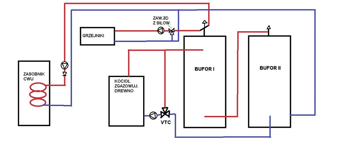 W schemacie zostały pominięte niektóre elementy typu naczynie przeponowe,zawór bezpieczeństwa i inny osprzęt ale to nie ma znaczenia jeżeli chodzi o zaistniały problem.Nie wiem czy gra rolę, że powrót z CO jest podłączony do powrotu z CWU czy raczej powinien być podłączony pomiędzy powrót z drugiego bufora a VTC to tak na marginesie Zapomniałem dorysować zaworu zwrotnego na "powrocie do powrotu" przy zaworze 3D