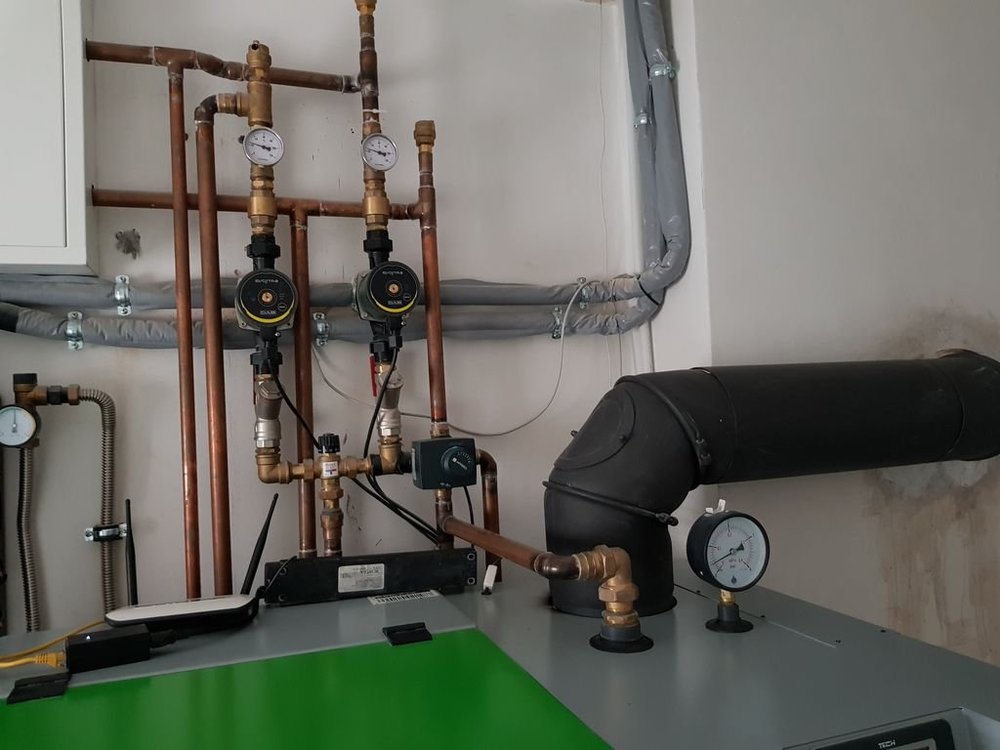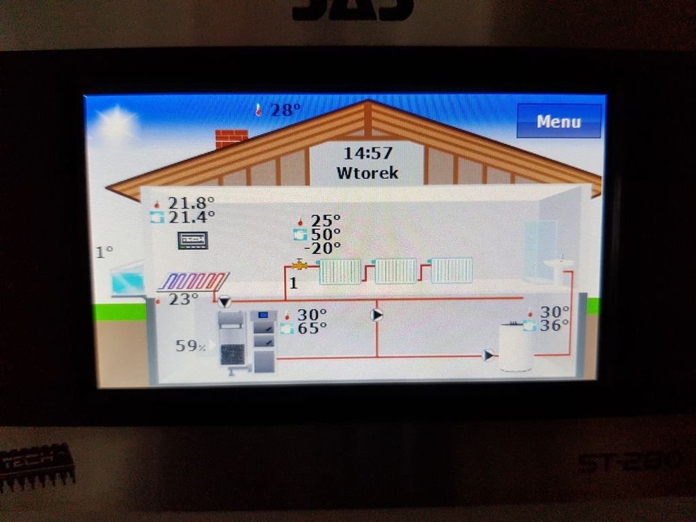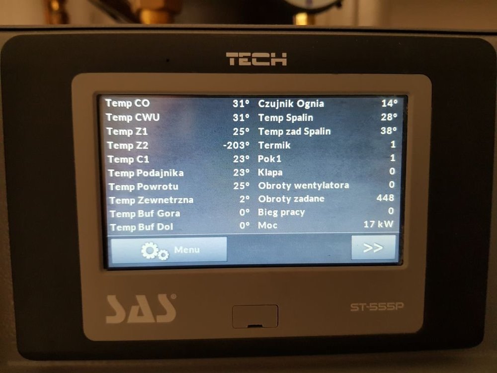 Dziękuję za szybką odpowiedź. Muszę poczytać gdzie się znajdują wspomniane elementy i je przeczyszczę. Natomiast jeśli chodzi o pompy to po osiągnięciu zadanej temperatury w pokoju pompa CO działa jeszcze plus minus ze 40 min po przejściu pieca w stan czuwania, a pompa podłogowa pracuje jeszcze ze 2-3h. Oczywiście czasy podałem mocno orientacyjne bo nigdy nie zwracałem na to uwagi, jedynie sprawdzając temperaturę na ST-280 widzę animację pracy pomp. Dodam jeszcze, że przy histerezie 0,3 na temperaturę w pomieszczeniu, piec podczas pracy nie osiąga zadanej temperatury 65 stopni. Piec przechodzi w stan czuwania jak jego temperatura wynosi ok 55 stopni, ponieważ wcześniej zostaje osiągnięta zadana temperatura w pomieszczeniu która wynosi 21,4 stopnia. Do ok godziny po przejściu pieca w tan czuwania temperatura w pomieszczeniu dobija do 22 stopni a temperatura CO do 65-70 stopni. Ogólne ustawienia do na PIDzie praca 2/8 (tak, wiem że to dla mocy 10kW :)), histereza 0,3 stopnia w pomieszczeniu, temperatura spalin 155 stopni, temperatura zadana CO 65 stopni, zawór 50 stopni, podłogówka chyba 35 stopni (ale nigdy nie było więcej niż 31). Dołączam wspomniane wyżej zdjęcia. Piec się nie włączył od rana więc nie wiem czy te dane z wyświetlacza sternika coś powiedzą. Niestety nie umiem opisać schematu instalacji, więc mam nadzieję ze to pomoże. Na jednym ze zdjęć będą widoczne zacieki przy wejściu rury w komin, nie jest to efekt wilgoci w kominie. Przed uszczelnieniem szamotem, dałem tam sporo gruntu który popłynął po kominie :) -
