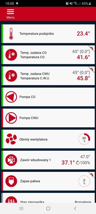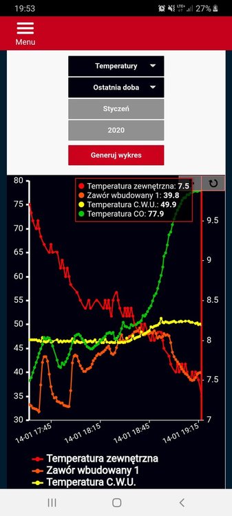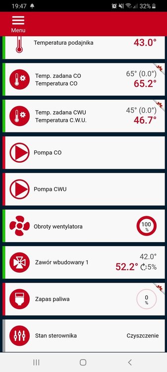 Udało mi się znaleźć kod i mam dostęp do wszystkich funkcji. Zatem odpowiadając na ustwienia zaworu: Skok - Skok jednostkowy 5% Czas oczekiwania - nie ma ale mam czas otwarcia - jeśli to to samo to mam 2 min 20 sekund Nieczułość - Przerw pomiaru? Jeśli tak to mam 15 sekund Minimalne otwarcie - 5% Proporcjonalność - Współczynnik proporcjonalności - 5 Wyłączyłem faktycznie zależność pompki od temperatury termostatu pokojowego i pompka faktycznie kręci cały czas ale poskutkowało to tym, że przy rozpaleniu piec nagrzał tylko do 55*C z zadanych 65*C i wygasił się gdyż uzyskałem temperaturę zadaną na termostacie pokojowym ale pompka dalej kręciła i podczas godziny obiegu temperatura spadała poniżej 35*C i pompka się wyłączyła co skutkuje temperaturą powrotu na poziomie znów 35*C więc nie wiem czy o to chodziło.... faktem jest że dłużej trzyma teperaturę zadaną na pokojówce z około godziny na 2 godziny. Za to przy rozpalaniu pewnie bedzie dłużej palił...... Tego się sodziewałeś, tak ma być?? Może jakieś inne pomysły? PS> histereza kotła zostawiłem fabrycznie na 2*C przy zadanych 65*C ale i tak nawet nie osiągnął 65*C - dobił do 56*C... -