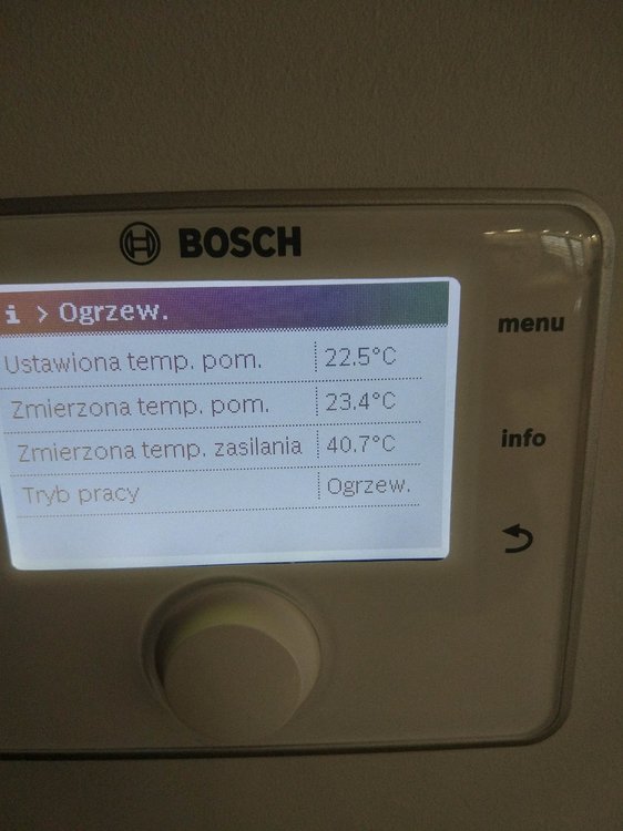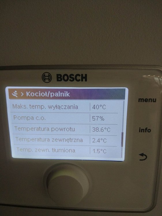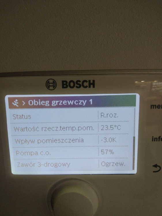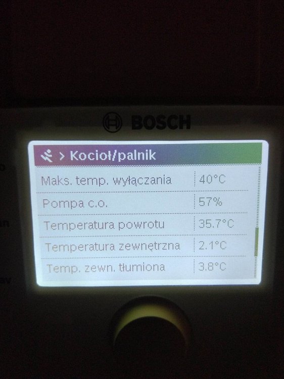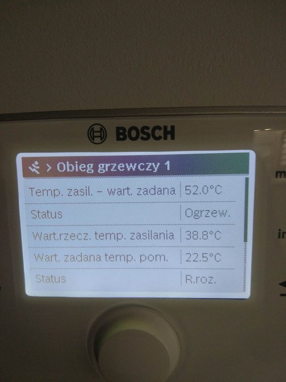 Sterownik CW400 jest w miejscu gdzie jest podłogówka na dole w salonie wraz z aneksem czyli w miejscu gdzie jest ok 50m2 otwartej przestrzeni. Sterownik tech steruje tylko podłogówka (przesyłam zdjęcie poniżej jak to wygląda). Z pieca idzie rurka z woda do rozdzielacza i tam podłogówką steruje zawór gdzie dalej idzie do następnego rozdzielacza bo mam porobione strefy grzania na podłogówce. Druga cześć wody idzie w grzejniki na górę i do garażu. Mam nadzieję, że da się zrozumieć (dosyłam zdjęcie dla lepszego zrozumienia). Wysyłam również aktualne zdjęcia z CW400 na temat powrotu wody. Mam jeszcze jedną teorie na ten temat, ale nie jestem specem w tych sprawach więc mogę nie mieć racji. Patrząc na zdjęcie, można zauważyć, że piec pracuje z minimalną mocą 14% czyli jakieś 2,8 kW. Jeżeli zawór od podłogówki jest otwarty tylko w 5 % to znaczy, że w miejscach gdzie mam porobione strefy i są kontrolery temperatury, zadana temperatura została osiągnięta wiec ciepła woda idzie w grzejniki na górze. Z racji tego, że kaloryfery działają tylko w 2 z 5 pokoi to nawet te 2,8 kW(minimalny płomień) jest za dużo bo temp powrotu jest 35,7 stopni i dlatego piec się wyłącza. Czyli reasumując, dom jest dobrze ocieplony i ciepło wyprodukowane przez piec przy minimalnym płomieniu i tak jest za duże, aby go odebrać na chwilę obecną. Czy to co napisałem ma jakiś sens i czy jest taka możliwość na takie zachowanie pieca? To tylko moja teoria ale jeszcze raz napiszę, że nie jestem specem :) -