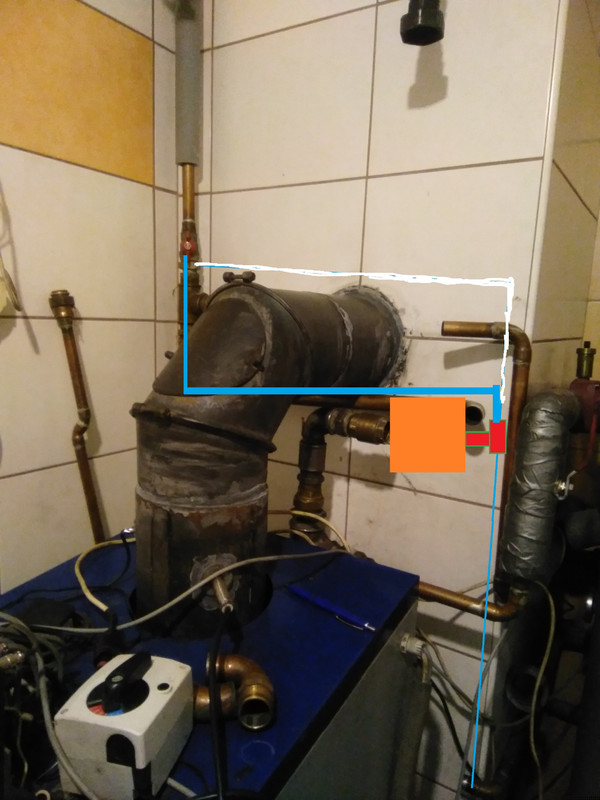 Może ktoś się wypowiedzieć odnośnie powrotu podłogówki. Mam zawór czterodrogowy, grzejniki + podłogówka. Czopuch z kotła wychodzi do góry, zasilanie jest zaraz pod czopuchem. Chodzi mi o wpięcie się do powrotu z grzejników powrotem z OP, a dokładniej poprowadzenie rur, czy mogę puścić rurę powrotną nad czopuchem i zejść później trochę w dół? Rura powrotna z OP idzie mi jakieś 120cm nad podłogą, a później musiałaby iść do góry, ponad wysokość kotła i nad zawór 4D. Ewentualnie czy na tym powrocie z OP dać jakiś odpowietrznik? Przebieg rur mniej więcej będzie tak jak na schemacie. Nie mam za wiele miejsc z tyłu kotła. -