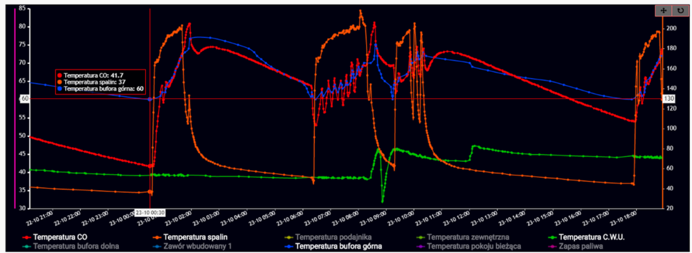 Mam moduł st66b i jest załączona opcja bufor. Poprostu dziwi mnie to że temperatura załączania pomp jest ustawiona na 61 stopni i poniżej tej temperatury piec się rozpala zamiast czytać poniżej wartość bufora góra.