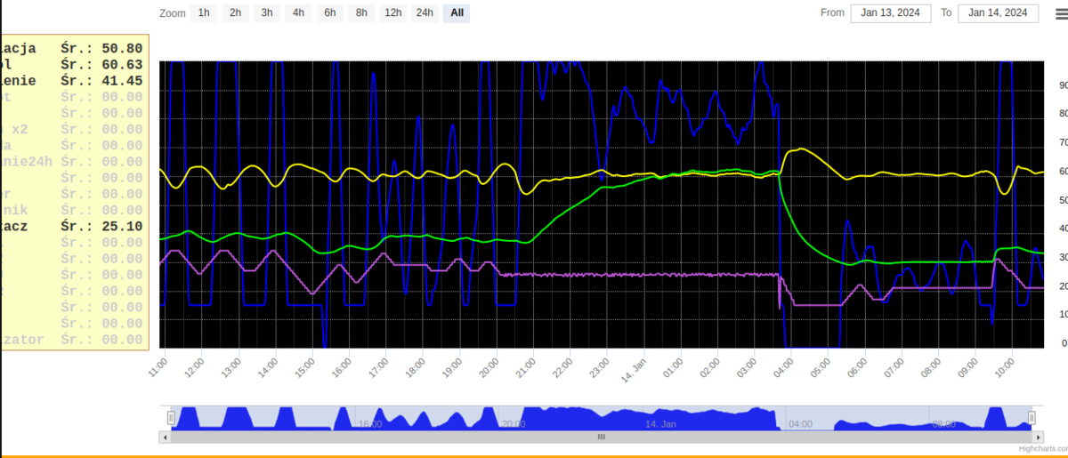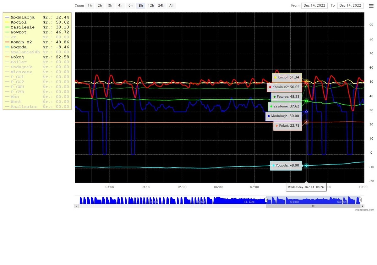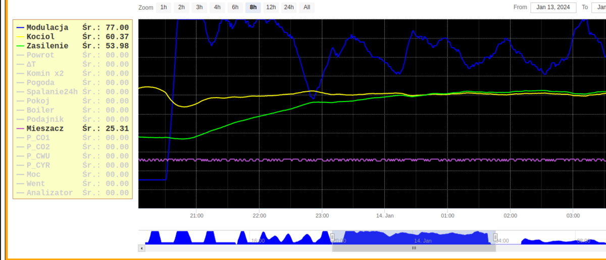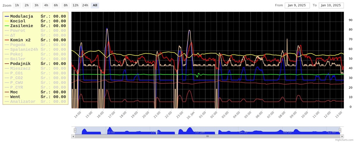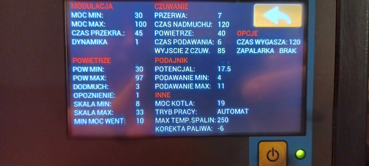 teraz tak ustawiłem tez zmieniłem z 30 na 20 , a max na 50% tak kociołem mam niby 29kW , ale palnik, jak na blok bo 35kW. Obecnie pale karlikiem , moc palnika ustawiona na 25kW, instalacja stara , w miarę moich możliwości przerobiona (dodanie pompy kotłowej , wstawienie mieszacza 4d , oraz termostatów przy każdym grzejniku -