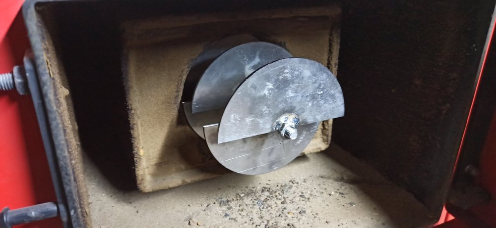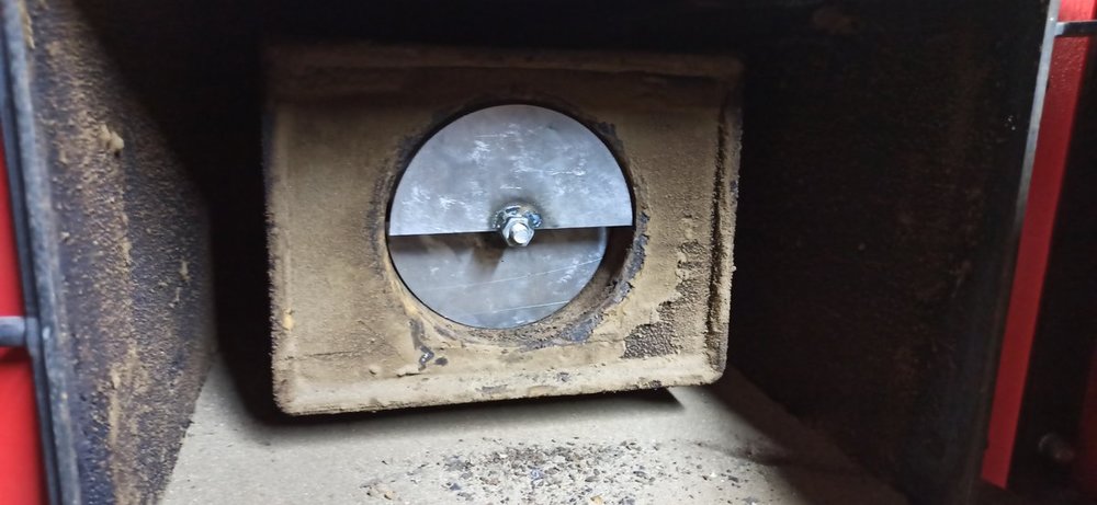 Moc pozostała bez zmian, 20kW nadmuch zwiększony do 33%. To lekkie zadymienie wywołane było dopalaniem się tego co osadzone było na ściankach pieca, drzwiczek itp, przy uszczelce drzwiczek było takie czarne zwęglone, może to jakieś sadze lub inne pozostałości nieoryginalnego pelletu... Nie wiem tak gdybam. Tak czy siak po dokładnym wyczyszczeniu pieca i wcześniejszym wypaleniu tego dziadostwa każdy kolejny cykl był już bezproblemowy. Póki co zawirowywacz bez zmian, nie rozsuwałem tych blaszek. Temperatura max 75', płomień ładny utrzymuje się w granicach 100%, regulator ciągu też już mniej się wychyla, wcześniej pracował niemalże non stop obecnie widocznie mniej, zmniejszyłem go też na 10 bo był na 15. -