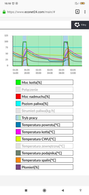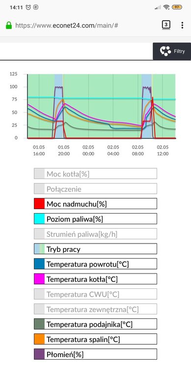 Możesz to rozwinąć? Nie za bardzo rozumiem jak może on wpływać na proces spalania, który odbywa się w palniku, przez ruszt przelatują same spaliny. Dwustanowo to chyba zgodnie z założeniem, palnik robi robotę wygasza się i czyści, postój i cykl zaczyna się na nowo? Chętnie przyjmę porady, oto moje aktualne nastawy oraz informacje z czujników: