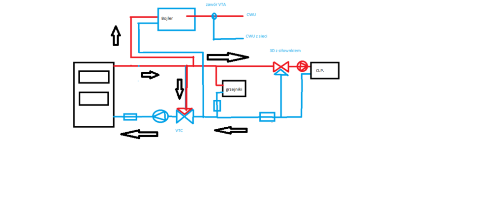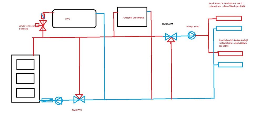 Mam zamiar dać zawór 3d VTC do ochrony powrotu, na zasilaniu obiegów OP zawór ATM 881 DN 25 (23-40 st.C) a przed tym zaworem zasilić grzejniki łazienkowe i zasobnik CWU. Dobrze by było zrobić to na 1 pompie, ale nie wiem czy się da.