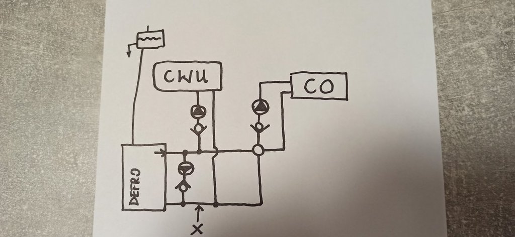 Witajcie, Mam kilka pytań, ponieważ nie wszystkie tematy są dla mnie jasne. Na początek wklejam schemat instalacji i kilka słów opisu. Gdybym interesował się tym wcześniej, instalacja wyglądałaby inaczej. Dom posiada instalację ogrzewania w oparciu o grzejniki aluminiowe oraz podłogówki w dwóch łazienkach oraz kuchni. Naczynko zbiorcze zasilane z odpowietrznika kotła. Na zasilaniu zawór bezpieczeństwa. Jakbym wiedział to, co wiem teraz, w instalacji byłoby sprzęgło i oddzielne pompy dla podłóg i grzejników. Oddałem jednak projekt i wykonanie w ręce fachowca, który zrobił instalację po taniości. Do tego stopnia, że nie zamontował pompy kotłowej, przez co zawór 4d praktycznie nie był w stanie utrzymać właściwej temperatury na powrocie kotla. Postarałem się o taką pompę, jednak nie wyglądam na zadowolonego z obecnego rozwiązania - chyba że jestem w błędzie i lepiej już z tą instalacją nie będzie. 1. W jakim celu montuje się zawory zwrotne przy pompach? Z tego co zdążyłem się zorientować, pompa blokuje przepływ w momencie gdy jest wyłączona. Mam dwie pompy IBO MAGI oraz kotłową MAGI 2. 2. Czy w miejscu zaznaczonym X powinien znajdować się zawór zwrotny? Na moje oko tak, tylko chciałbym, aby to ktoś potwierdził. W tej chwili załączenie pompy kotłowej powoduje spadek temperatury w kierunku grzejników. Tak jakby pompa mieszała w obiegach kotła oraz "grzanym", zamiast tylko w obiegu kotła. Czy w ten sposób nie wyciąga ciepła z instalacji, czy to zawsze będzie działać w ten sposób? Obserwacje potwierdzone pomiarem temperatury rur przy pomocy termopary.