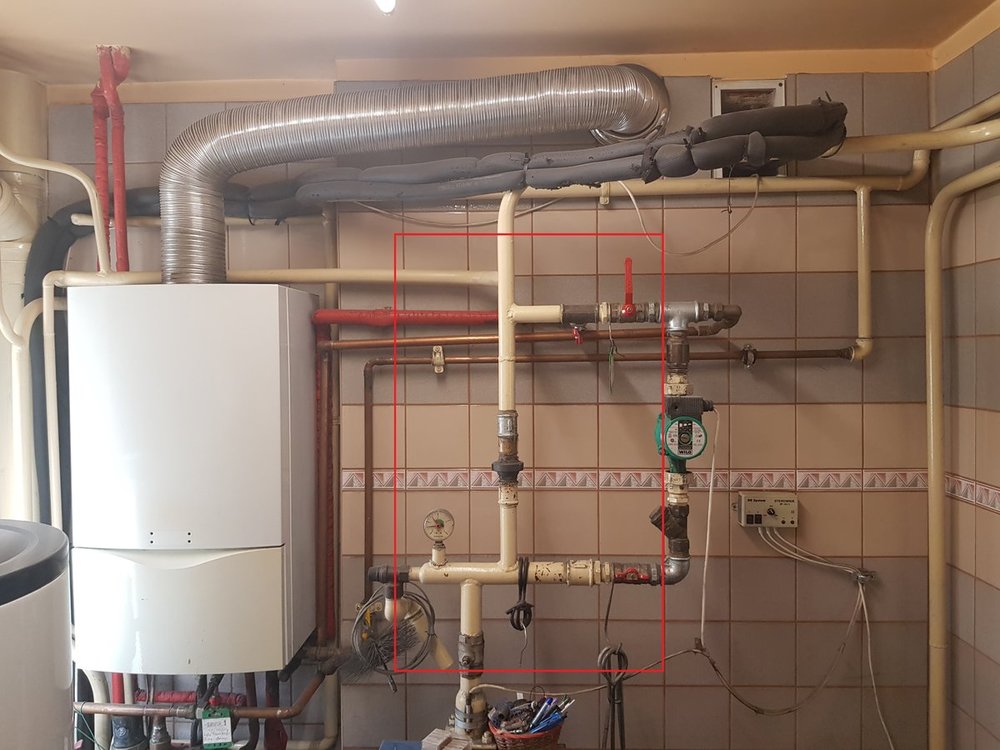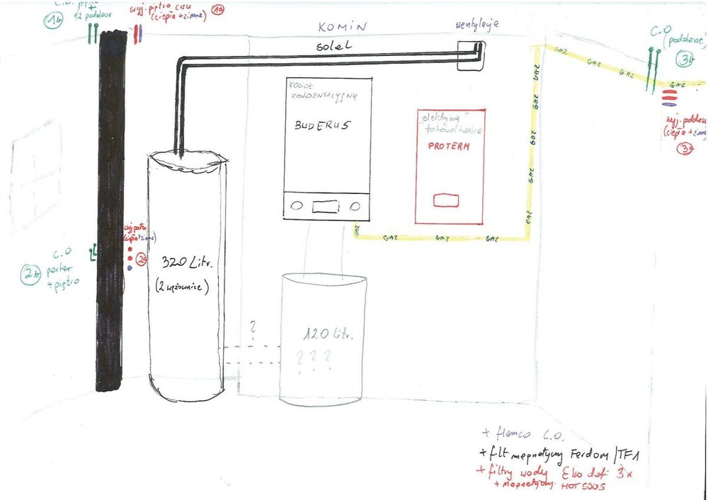 W załączeniu pozwalam sobie przesłać zdjęcie kotłowni (nie przerażać się proszę), oraz mój koncept z naniesionymi na czerwono i zielono c.w.u. i c.o. Z tego co prześledziłem rury obecnej instalacji, można byłby wyodrębnić 2 obiegi, żeby poddasze miało swój regulator, parter swój regulator. Wersje, żeby to zrobić są chyba tylko 2 :