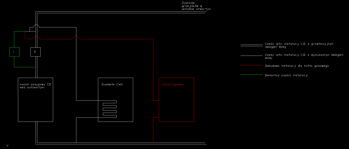 Cześć. Myślę nad instalacją kotła gazowego w istniejącej starej(lata 90) instalacji z prostym kotłem zasypowym bez żadnej automatyki(w tym brak wentylatora) Istniejąca instalacja pierwotnie działała w układzie grawitacyjnym. Po wymianie zasobnika CWU w układzie poziomym nad kotłem na pionowy na posadzce została jedynie dołożona pompa obiegowa("1") i zawór kulowy("2"). Czy można teraz do tego układu wpiąć kocioł gazowy tak jak myślę i pokazałem na schemacie? Założenie jest takie aby w kotle zasypowym palić w sumie przez miesiąc w ciągu roku w czasie najniższych temperatur drewnem(mam za darmo z wycinki drzewek, mam dostęp do palet i odpadów z warsztatu stolarskiego). W czasie pracy pompy w kotle gazowym pompa zamknie obieg w nieużywanym kotle zasypowym zaworem kulowym aby nie było tam strat ciepła. Ogrzewanie kotłem zasypowym działałoby na zasadzie grawitacyjnej. Obecnie wyłączając pompkę obiegową ("1") poza CWU tak to działa. Wówczas należałoby wyłączyć kocioł gazowy aby zawór kulowy mógł się otworzyć umożliwiając obieg grawitacyjny. Czy jest możliwość zasterowania pracą kotła gazowego na zasadzie: Jeśli czujnik temperatury(np na wylocie spalin) wykryje rozpalenie kotła zasypowego to wyłącza się kocioł gazowy? Stary kocioł zasypowy ma już 15 lat i w przypadku jego awarii przejdę całkowicie na ogrzewanie gazowe dlatego nie chciałbym mocno inwestować w dostosowanie instalacji do dwóch źródeł ciepła. Poza tym jak pisałem nie zamierzam palić już w nim regularnie.