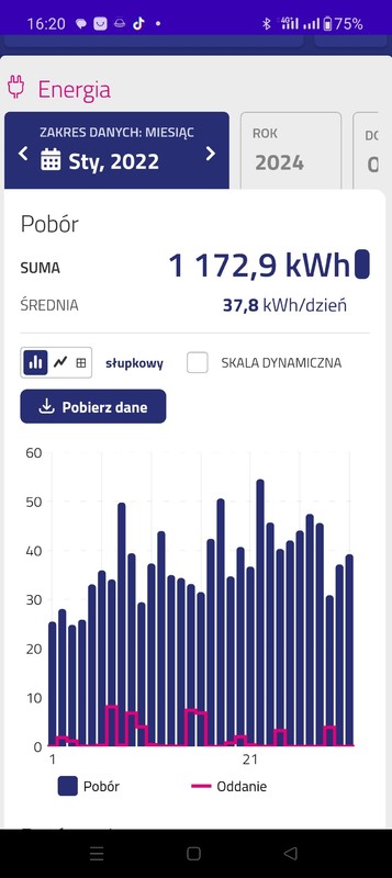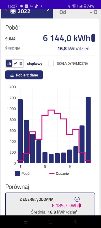 Prąd i ogrzewanie domu za 300 zł rocznie! Porównam Net billing do net metering. Prawdziwy stan licznika. https://www.youtube.com/watch?v=Q0td0K_3eXQ Ostatnio przez sieć przelała się fala artykułów Straszących wysokimi rachunkami za prąd po zainstalowaniu pompy ciepła i fotowoltaiki. Jednak dobrze dobrana instalacja fotowoltaiczna oraz odpowiednio ustawiona pod fotowoltaike pompa ciepła może generować rachunki za prąd dla domu oraz ogrzewania na poziomi około 300zł rocznie, czyli tylko koszty stałe za przesył, opłatę mocową itp. Dziś pokaże wam jak to wygląda na moim przykładzie, zobaczymy prawdziwy odczyt z licznika aby nie być gołosłownym. Zrobię też symulacje dla nowego systemu rozliczeń net billing, dla mojej instalacji oraz dla takiej która obecnie często firmy montują klientom wraz z pompą ciepła. Dowiemy się czy przy pompie ciepła i fotowoltaice na obecnych warunkach korzystniejsza jest mała instalacja nastawiona na autokonsumpcję czy może większa. Powiem też jak zmniejszyć rachunki za prąd przy pompie ciepła i fotowoltaice w net billingu. Często czytam w komentarzach że ogrzewanie pompą ciepłą jest nieopłacalne, że fotowoltaika nigdy nie wyprodukuję wystarczającej ilości pądu aby wystarczyło na ogrzanie domu pompą ciepła oraz na potrzeby bytowe. Dziś obalę ten mit pokazując wam stan mojego dwukierunkowego licznika energii. Ale zacznijmy od początku. Dom od 10 lat nie był przerabiany i jest stale zamieszkiwany przez 4 osoby. Budynek jest ocieplony 15 cm styropianu, część z garażem ma 10 cm ocieplenia. Dach ocieplony jest 30cm wełny mineralnej. Z ciepłej wody korzystają 4 osoby w tym dziennie 3 x wanna gorącej wody plus prysznic. Ogrzewanie podłogowe mam na powierzchni 130m2 i w tych pomieszczeniach utrzymuje temperaturę 21-24C, kaloryfery ogrzewają piwnice gdzie temperatura wynosi około 18C i garaż gdzie jest około 10-12 stopni C. W 2019r zamontowałem instalacje Fotowoltaiczna o mocy 7,29kWp za 21100zł. Przez 3 lata produkcja z foto pokrywała moje potrzeby, jednak z czasem przybyło mi energochłonnych urządzeń, jak zamrażarka, rowery elektryczne, suszarka do ubrań, robot koszący czy klimatyzacje. W związku z tym postanowiłem końcem 22r. roku powiększyć instalacja PV o 2,7kWp do łącznej mocy 9,99kWp. Rozbudowa kosztowała mnie 11.5 tyś zł Na fotowoltaike 9,99kWp łącznie wydałem 32600 zł, nie uwzględniam tu dotacji i zwrotów z podatku, ponieważ każdy z was mógł otrzymać innej wielkości zwroty. Końcem 2019r zamontowałem pompę ciepła Panasonic T-Cap 9kW, na co wraz z montażem wydałem 40tyś zł. Tu także nie wliczam ewentualnych zwrotów i dotacji. Suma kosztów za PC + PV to 72.600zł. Produkcja prądu z fotowoltaiki Produkcja energii w 2023r. PV1 7,29kWp : 7529kWh PV2 2,7kWp : 2204kWp Suma: 9733kWh Autokonsumpcja = 9733kWh (produkcja PV) - 7338(nadwyżka) = 2 395 kWh (autokonsumpcja) Mój dom zużył w rok 8250kWh Autokonsumpcja + pobór 2 395 kWh + 5855kWh = 8250kWh Autokonsumpcja wyniosła u mnie ponad 25 procent. Najczęściej autokonsumpcja w Polsce mieści się w przedziale 20-30 procent. Energia oddana po zbilansowaniu : 7336,2kWh - do wykorzystania z wirtualnego magazynu po uwzględnieniu opustu 0:8 (1467.2kWh) miałem 5869 kWh Z sieci pobrałem po zbilansowaniu 5831,5 kWh Na 2024rok zostało mi 37.5kWh nadwyżki. O co chodzi z tym bilansowaniem miedzyfazowym? Najprościej to wytłumaczyć na przykładzie czajnika i 3 fazwoej instalacji która produkuje 3000W, po 1000W na każdej z faz. Czajnik pobiera 2000W na jednej fazie. Bez bilansoania pobieraliśmy brakujący na danej fazie 1000W z sieci, pomimo że na dwóch pozostałych fazach wprowadzaliśmy do sieci sumarycznie 2000W ze strata 20% z powodu systemu opustów. Po zbilansowaniu nie tracimy 20% energii z powodu przeslania naszej energii z jednej fazy na drugą. Ja jestem w starym systemie net-meteringu, inaczej to wyglądałoby gdybym rozliczał się w net-billingu. Po uwzględnieniu autokonsumpcji zgromadziłbym na sub-koncie 3180zł za które odkupiłbym około 2900kWh prądu, więc na moje potrzeby zabrakłoby mi 2964kWh za około 3260zł. A co gdybym do mojej pompy zamontował instalacje 3,3kWp , tak jak to teraz robi wiele firm? Przyjąłem ze poziom autokonsumpcji wyniesie aż 50%. Produkcja z PV u mnie wyniosłaby około 3212kWh z czego 1606 kWh zużyłbym na bieżąco, a na subkoncie zgromadziłbym 711zł. Mój dom zużył w rok 8250kWh - 1606kWh (autokonsumpcja) = 6644kWh Na koncie net-billing zgromadziłbym 711zł za które odkupiłbym 646kWh To sprawdźmy jeszcze jak by to wyszło z instalacją 16 Kwp. Przyjąłem tu poziom autokonsumpcji 16% Produkcja z PV wyniosłaby około 15573kWh z czego 2492 kWh zużyłbym na bieżąco, a na subkoncie zgromadziłbym 5788zł. Mój dom zużył w rok 8250kWh - 2492kWh (autokonsumpcja) = 5758kWh Na koncie net-billing zgromadziłbym 5788zł za które odkupiłbym 5261kWh więc na moje potrzeby zabrakłoby mi 497kWh za około 546.7 zł zł. Przy instalacji 3,3kWp zabrakłoby mi 5998 kWh na które wydałbym 6598 zł (15 lat =98970zł, 20 lat= 131960zł) Przy instalacji 10kWp zabrakłoby mi 2964kWh za około 3260zł. (15 lat =48900kWh, 20 lat =65200zł) Przy instalacji 16kWp zabrakłoby mi 497kWh za około 547zł. (15 lat =8205zł , 20 lat =10940zł) Trzeba też wziąć pod uwagę różnice w kosztach budowy instalacji 3,3kWp oraz 10kWp. Średni koszt instalacji 3,3kWp to 14-17 tys zł. Średni koszt instalacji 10kWp to 30-36 tys zł średni koszt instalacji 16kWp to 46 -50 tyś zł. Różnica w kosztach instalacji fotowoltaicznej 3 , a 10 kWp to niecałe 20 tys złotych, zaś różnica w kosztach zakupu prądu to w perspektywie 15 lat to aż 50700zł, zaś w pespektywie 20 lat to już 66760zł Do ustawowego limitu płacimy za prąd w sumie ok. 70 gr za kWh, a następnie po jego przekroczeniu średnio ok. 1,20 zł za kWh. Ja kWh liczyłem po 1,1zł. ponieważ już k